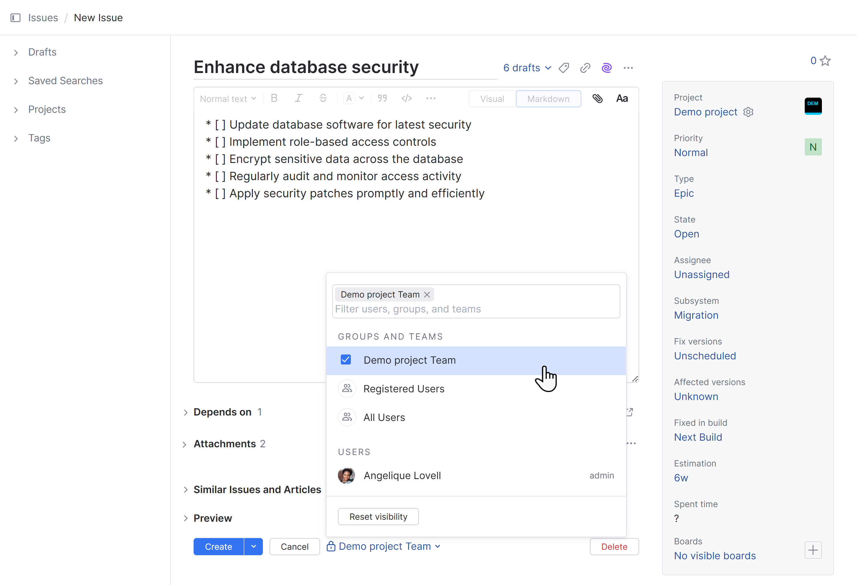 Below the Attachments section is a menu that lets you set the visibility for the new issue.