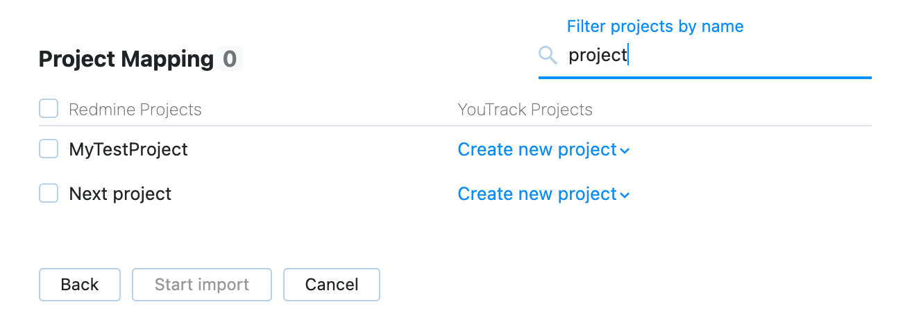 YouTrack recognizes when a web address has already mapped a source project by a previous import. Imported source projects that have already been mapped in YouTrack aren't selectable. You can create multiple import jobs from the same source without importing duplicate data.