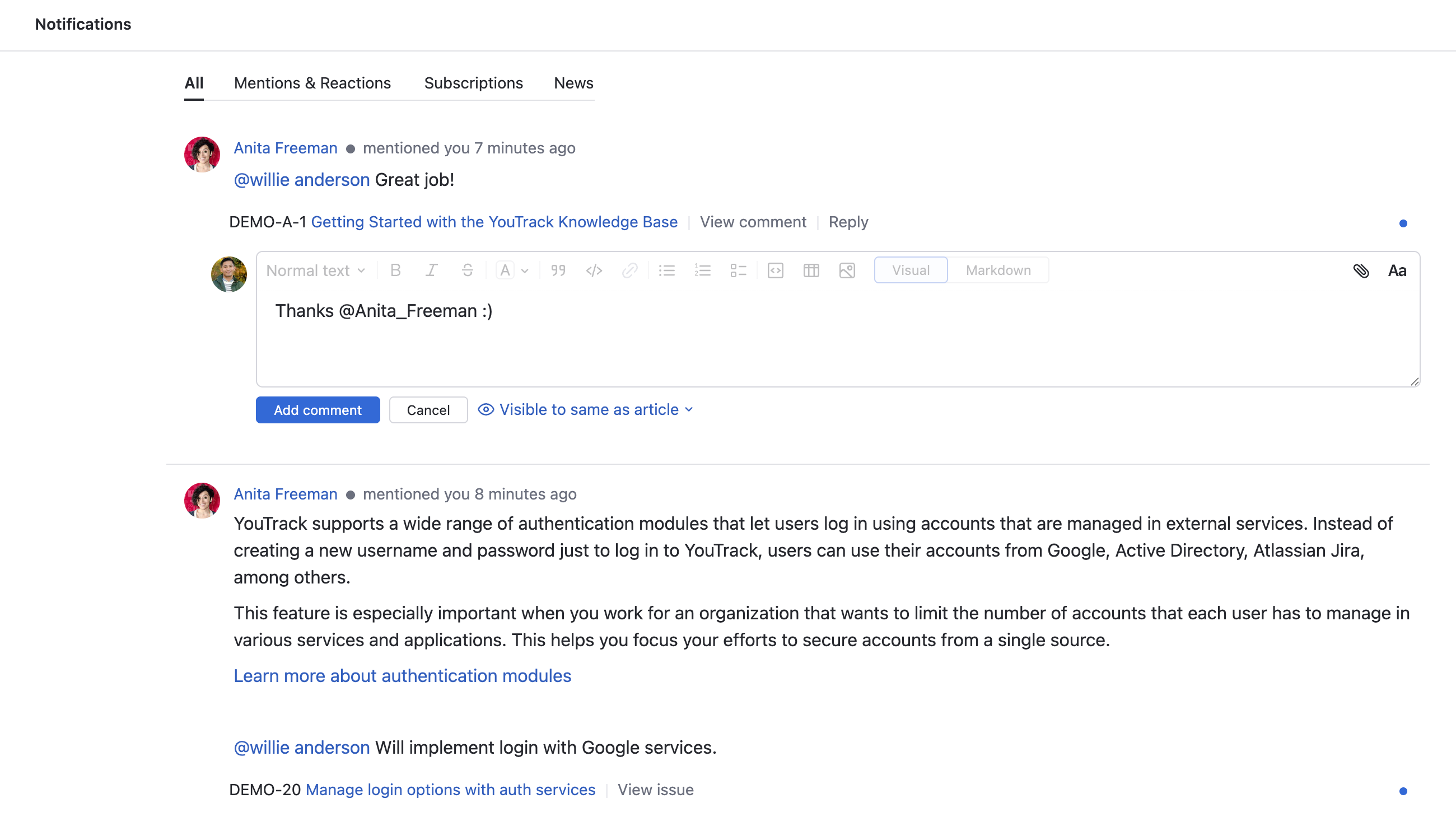 When viewing notifications in full-page view, you can reply to comments where you have been mentioned without leaving the page. This allows you to participate in discussions on issues and articles directly from the notification list.