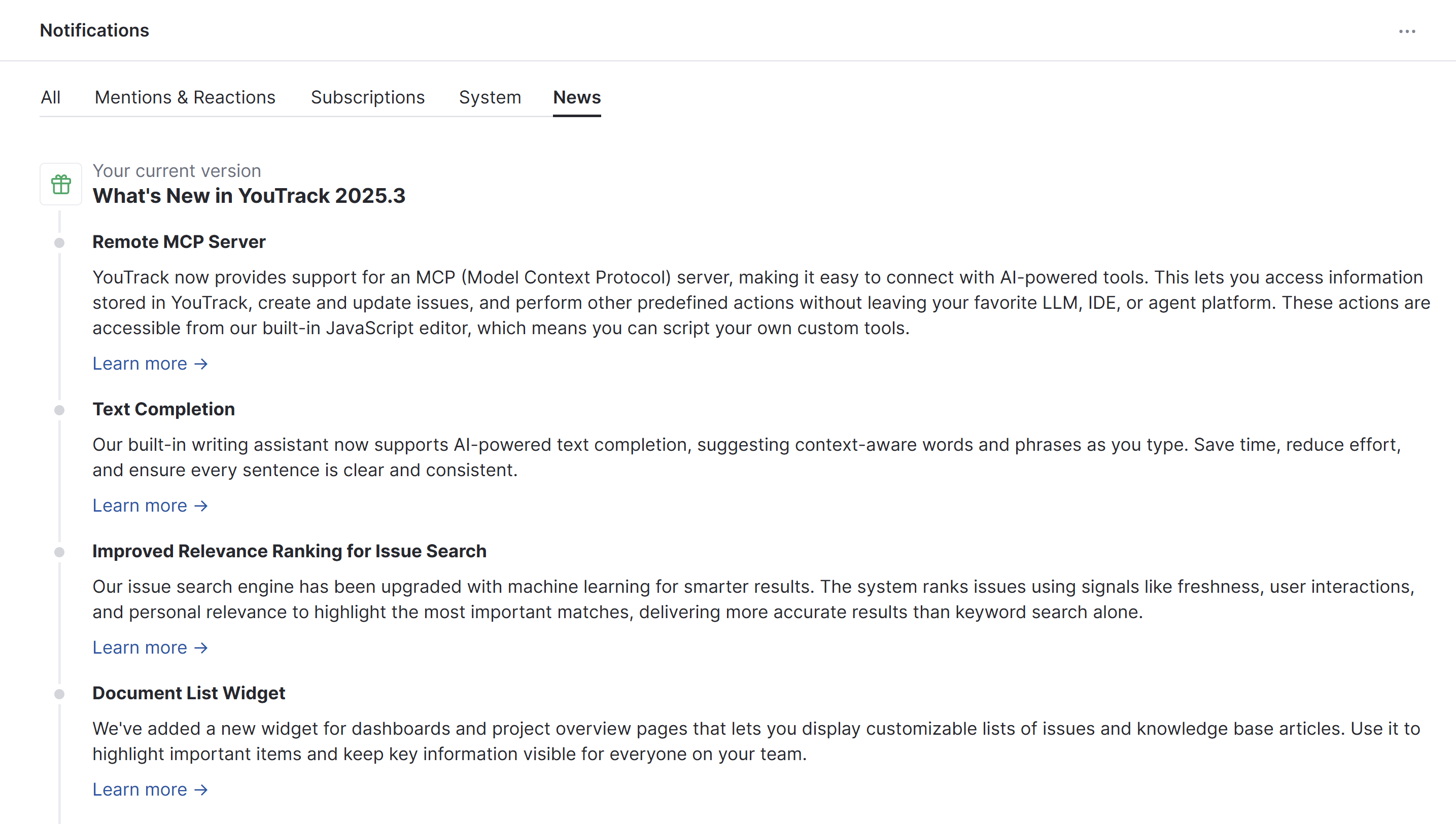 This feed provides short descriptions of major features that are included in each YouTrack release. Most features include a link to a related section of the documentation where you can learn how to put this feature to good use.