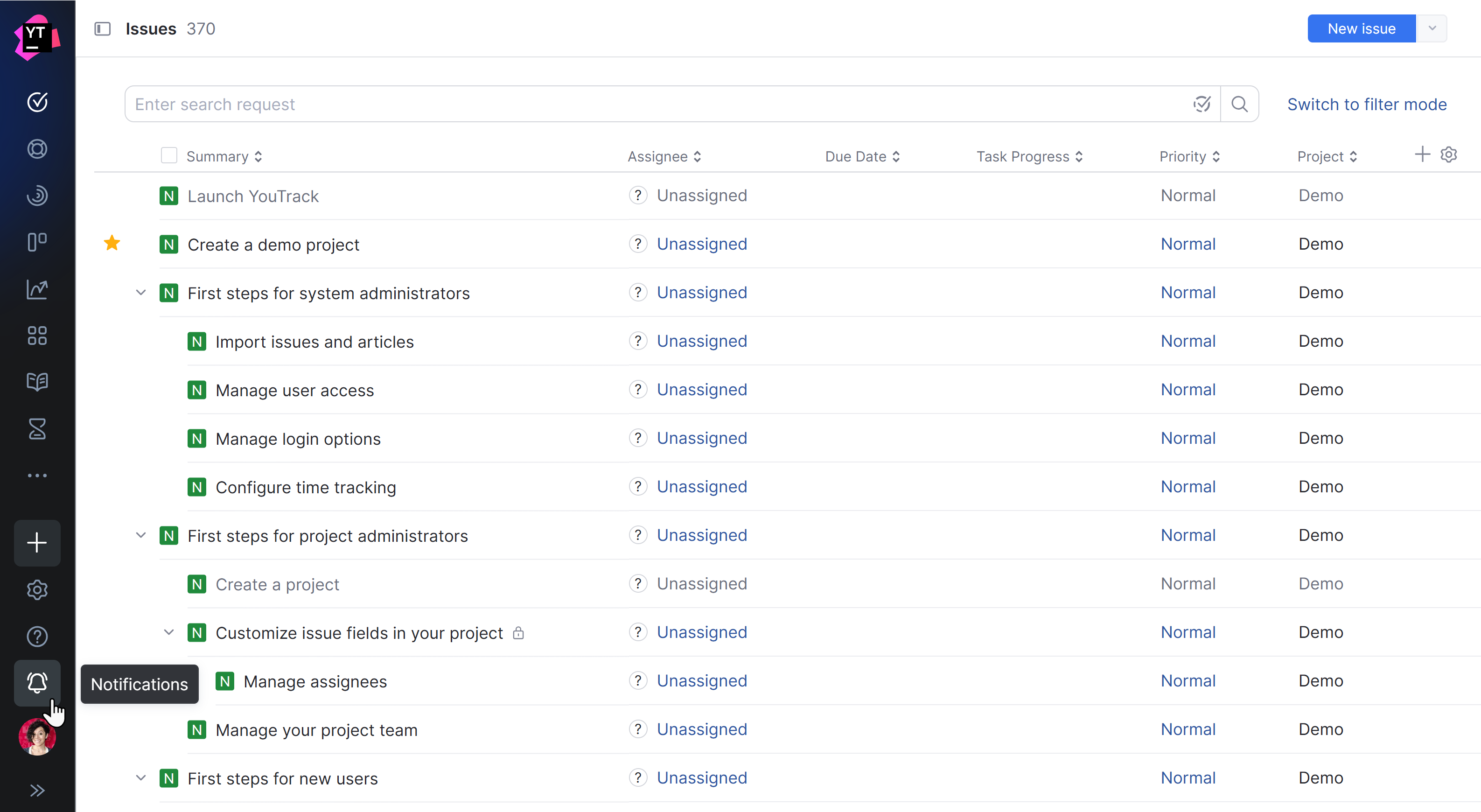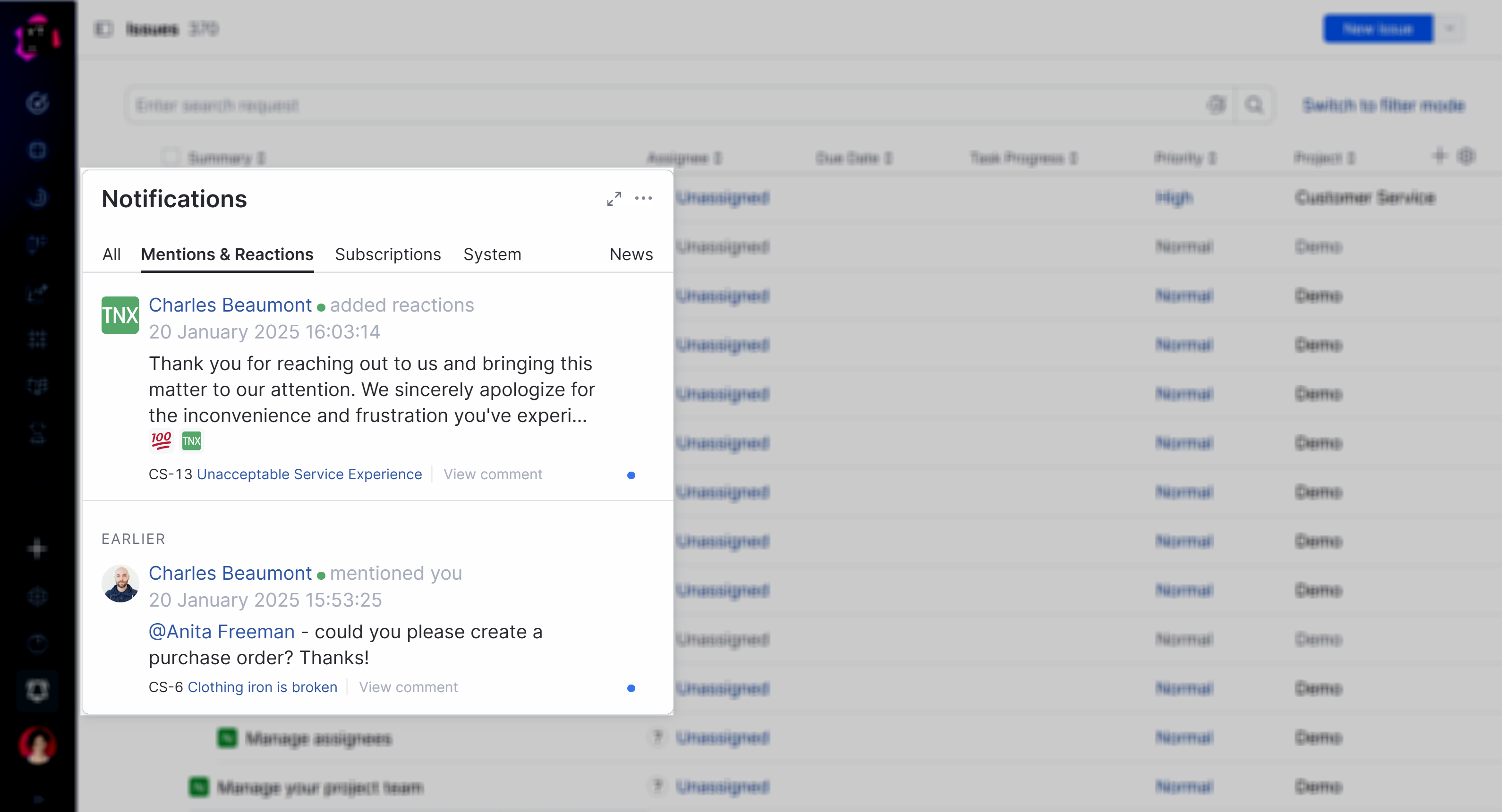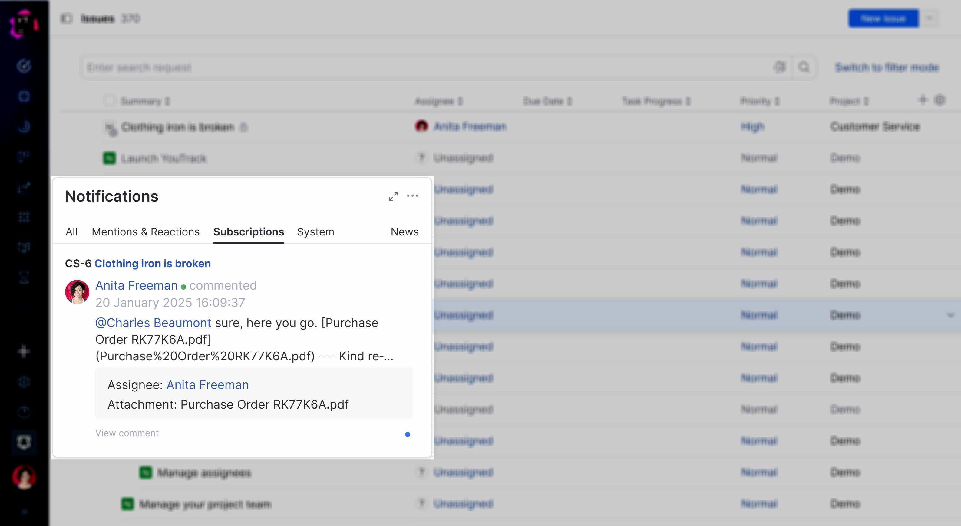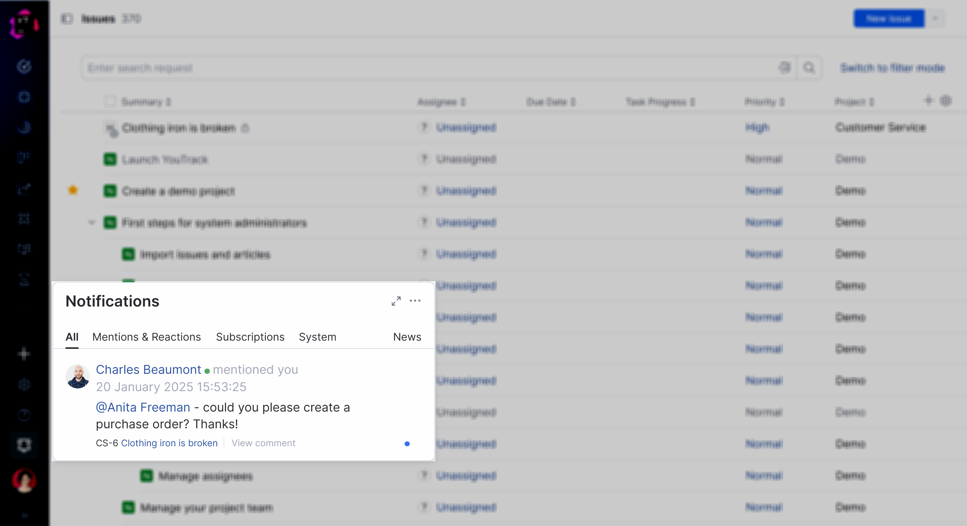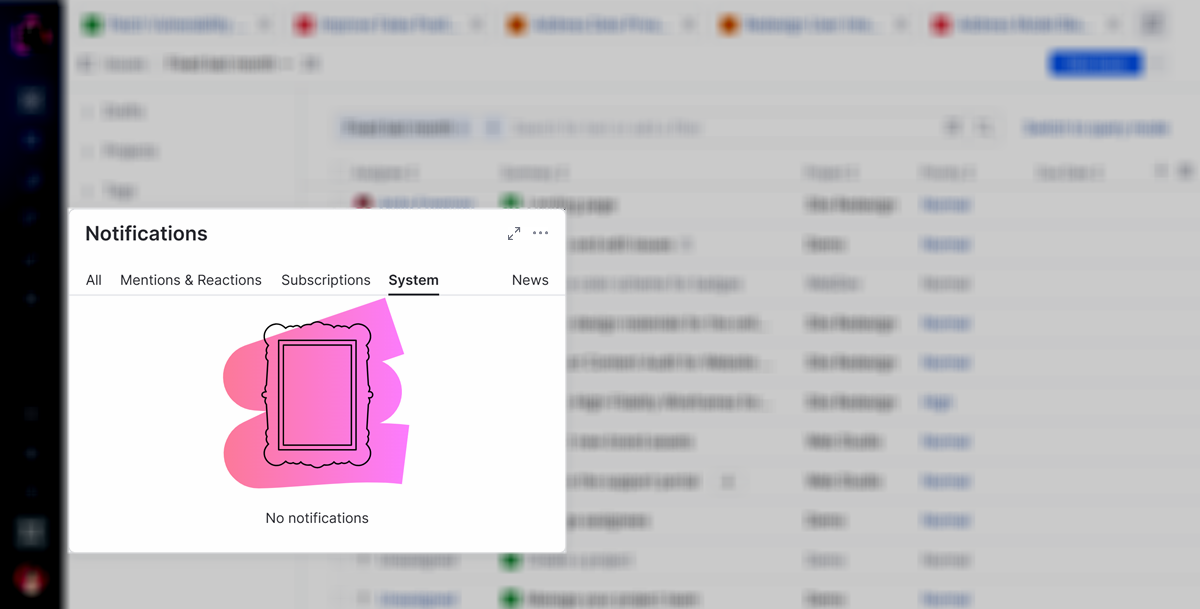 YouTrack has its own built-in notification center. The notification center delivers messages that match your subscriptions, alerts you when another user mentions you in an issue or comment, and shows reactions from other users to your comments.
