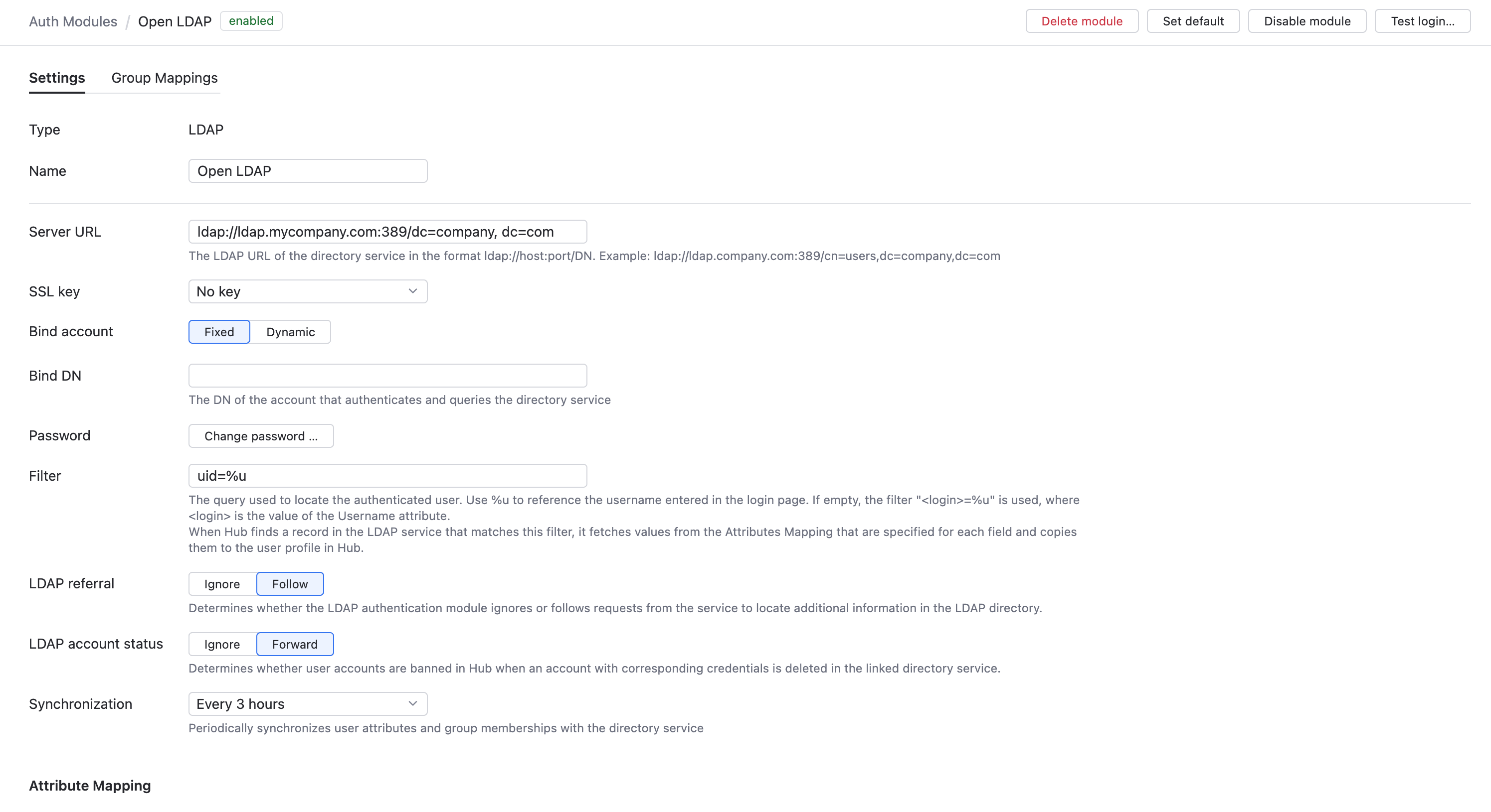 Username | Required. Maps to the LDAP attribute that stores the value to copy to the Username field in the Hub account. For OpenLDAP, the default value is |