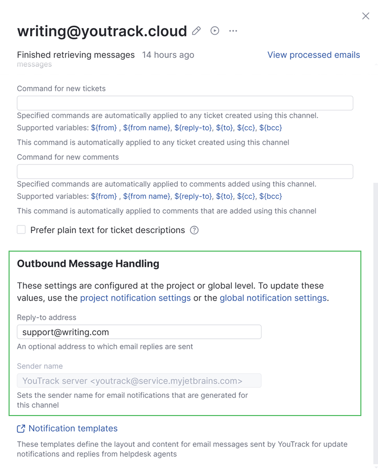 Sender name | The name that is shown in email client apps as the sender for email notifications that are generated for your YouTrack instance. Use this setting to override the sender name that is used at the global level. This setting is only available when your YouTrack Cloud instance uses the default connection for email notifications. To update this value, open the Notifications settings in your helpdesk project. To learn more, see Manage Project Notification Settings. |