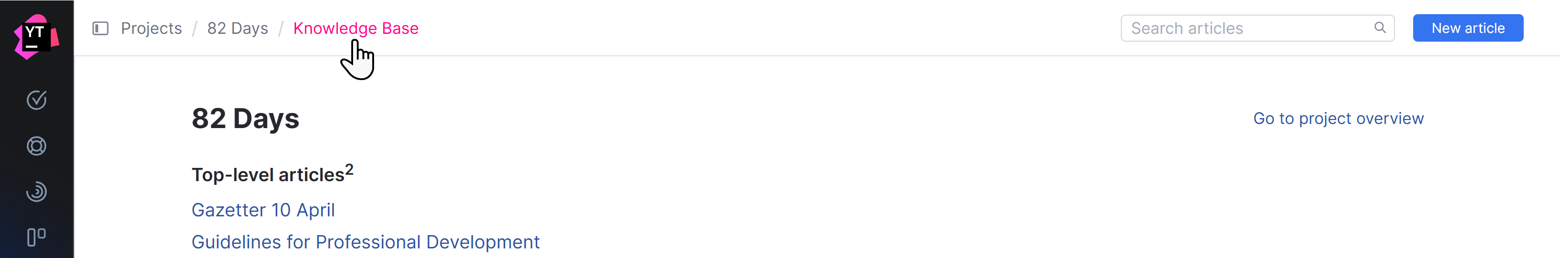 If you're viewing an article in the knowledge base, clicking the Knowledge Base link in the header opens a list of articles in the current project.