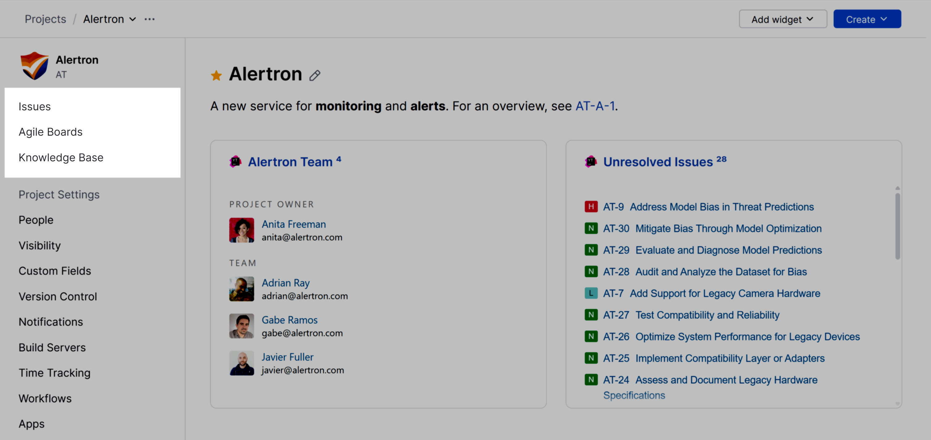 From here, use the Issues, Agile Boards, and Knowledge Base links to locate information stored in this project.