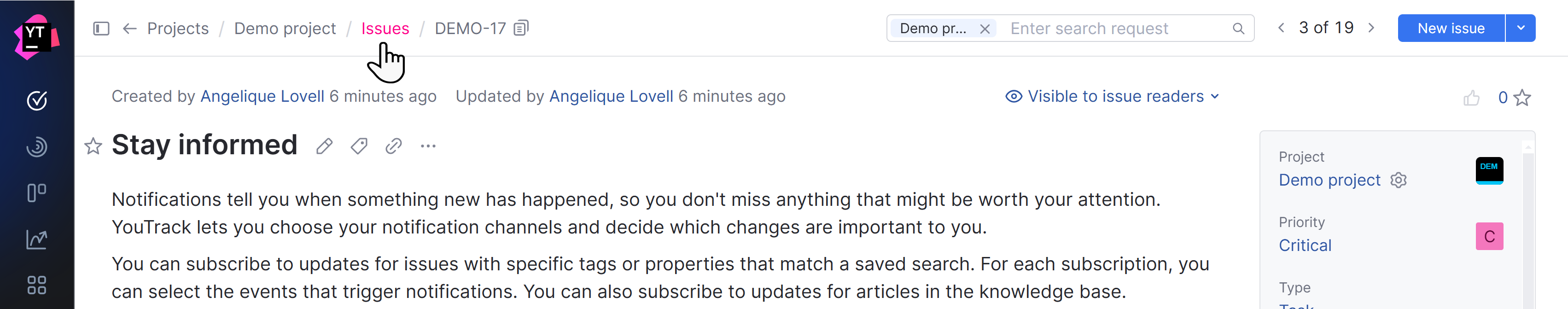 YouTrack's project-centric navigation helps you focus on a specific context for your work, minimizing distractions from unrelated content.