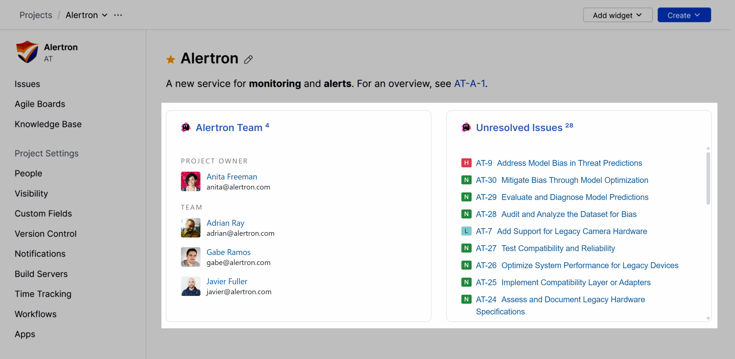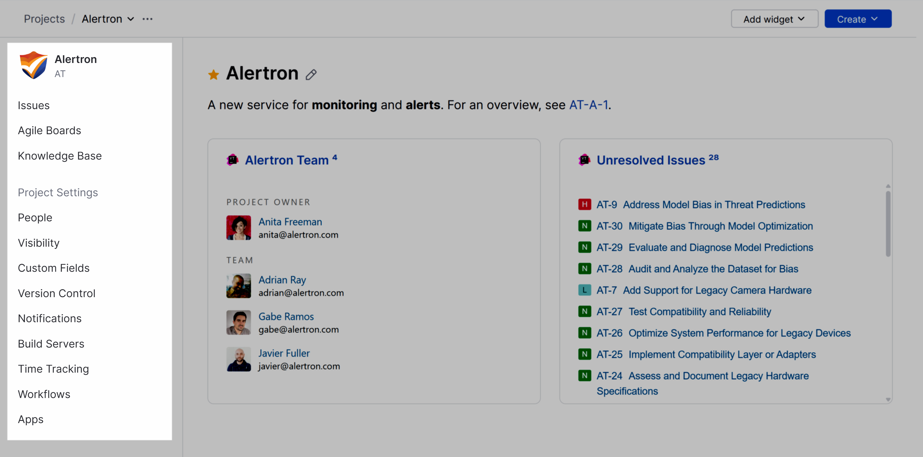 This page displays the project description and provides quick access to agile boards and project administration pages. It also provides a dashboard-like interface where you can add widgets that let you monitor the activity in your project.