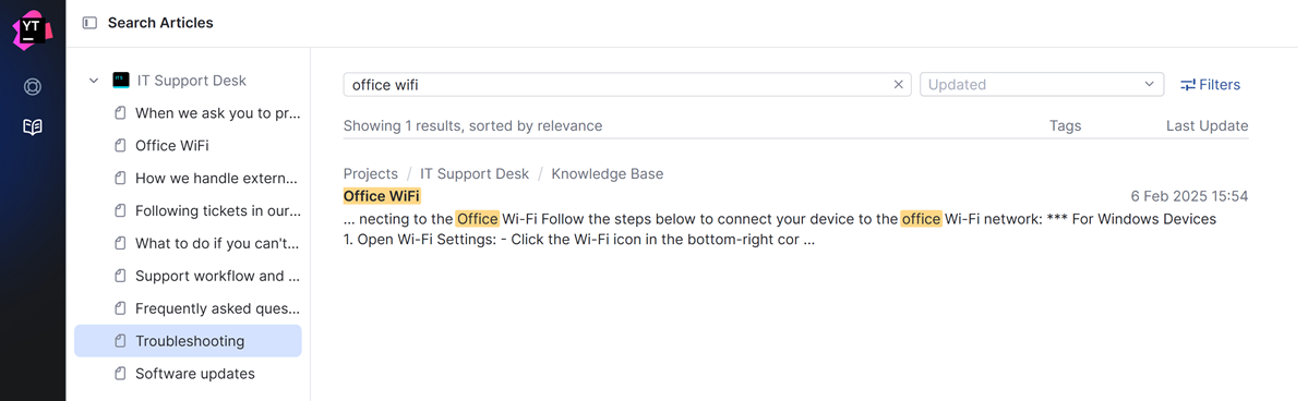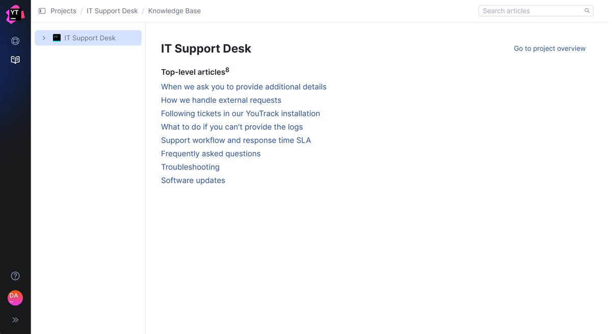 When you open a ticket in YouTrack, you also get access to the public articles in the knowledge base that the service provider has made available.