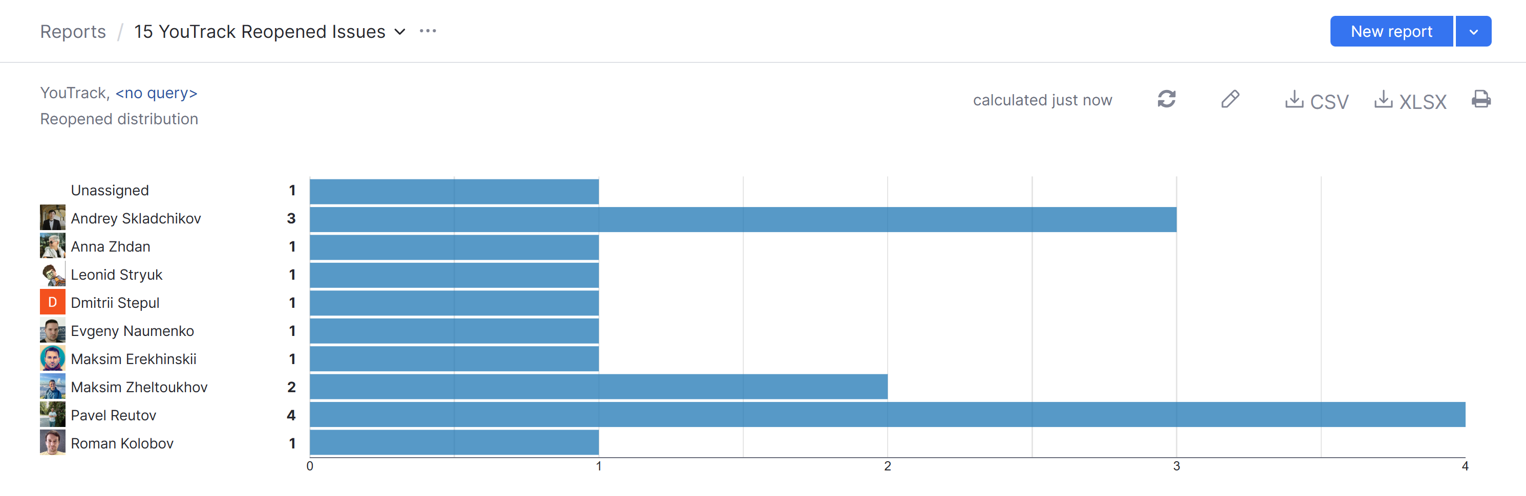 A report with the following settings displays the total number of issues that were fixed by each developer and were later reopened this year.
