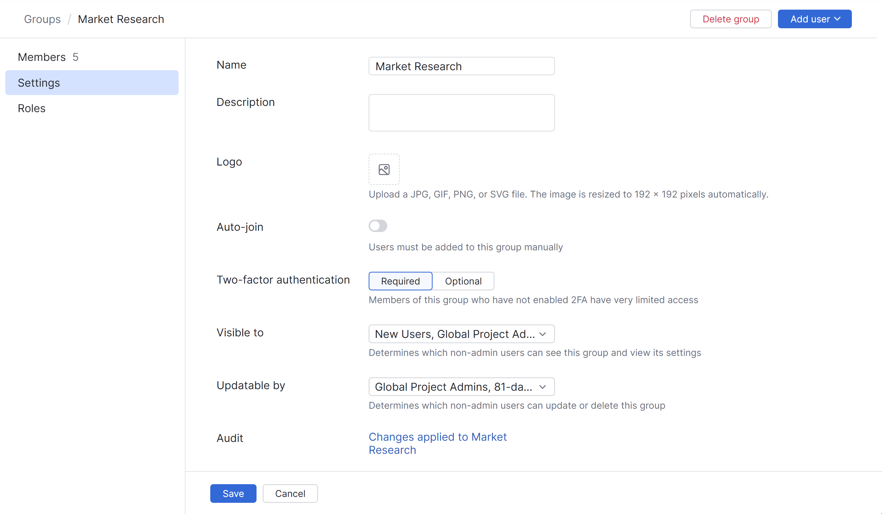 Click the name of the group for which you want to require 2FA. Use the filter in the page header to find a group by name, role, or another supported attribute.