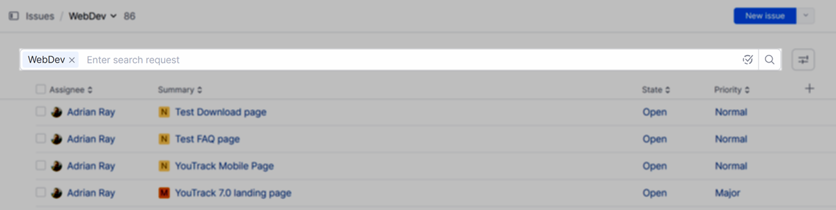 Saved searches | Any saved search that you have marked as a favorite is also available as a search context. To add a saved search to your list of favorites, use the controls in the Saved Searches section of the sidebar on the Issues list. You can also manage your favorites on the Tags and Saved Searches tab of your YouTrack profile. |