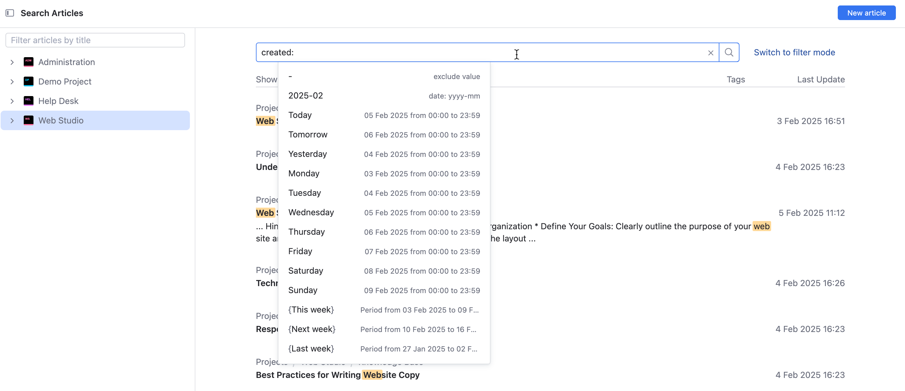 | To find all articles created on or before March 10, 2018, enter To find articles with tags that start with To find articles that contain image attachments in PNG format, enter |