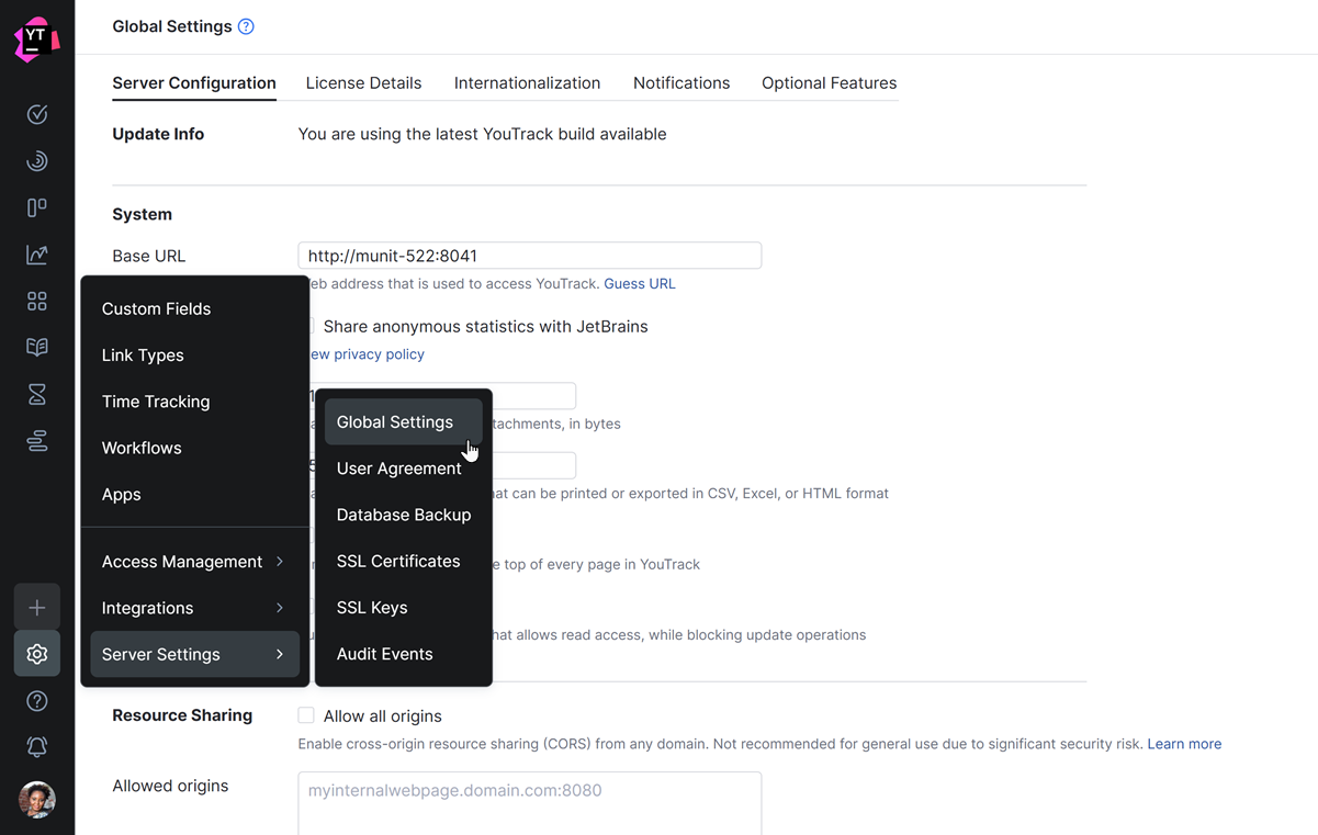 The topics in this section of the documentation provide instructions for managing the settings of your YouTrack server as an administrator. The options described here are available from the Server Settings section of the Administration menu.
