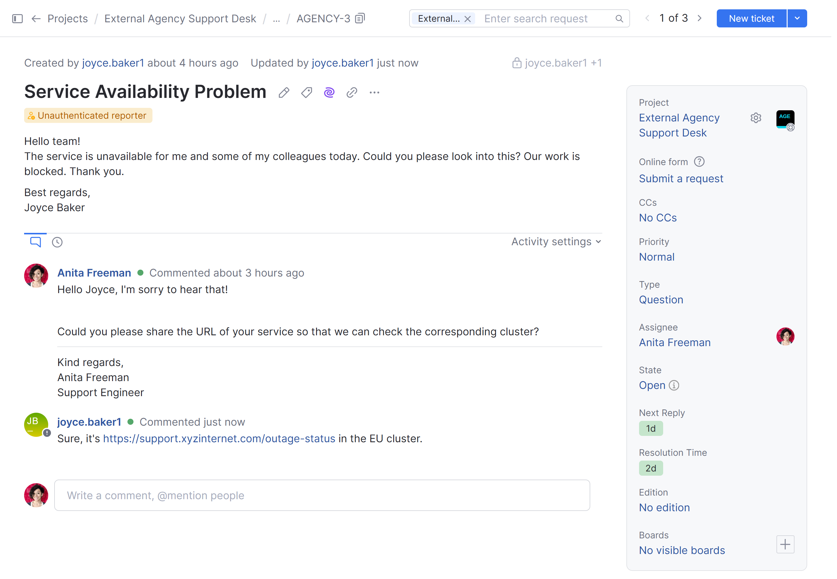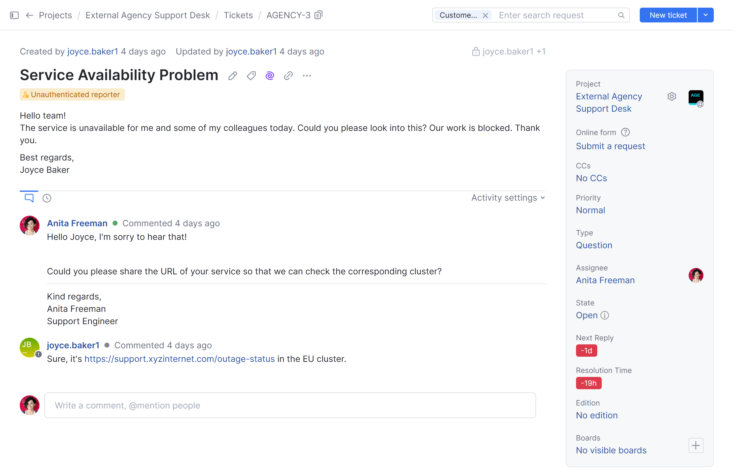 Let's look at a project with an active SLA policy. We'll go over all the stages that one particular ticket goes through from the moment it's been reported until it's closed.