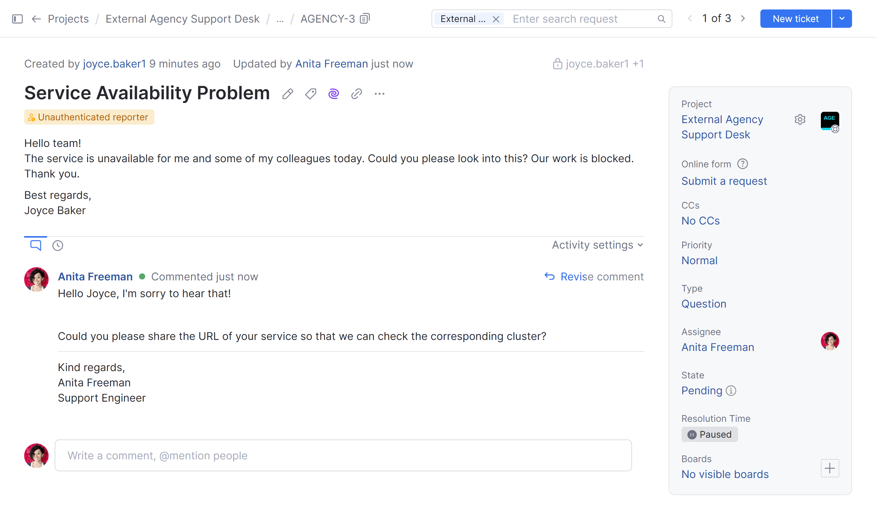 In one hour, the helpdesk agent responds to the customer and asks for more details. The agent sets the state of the ticket to Pending.