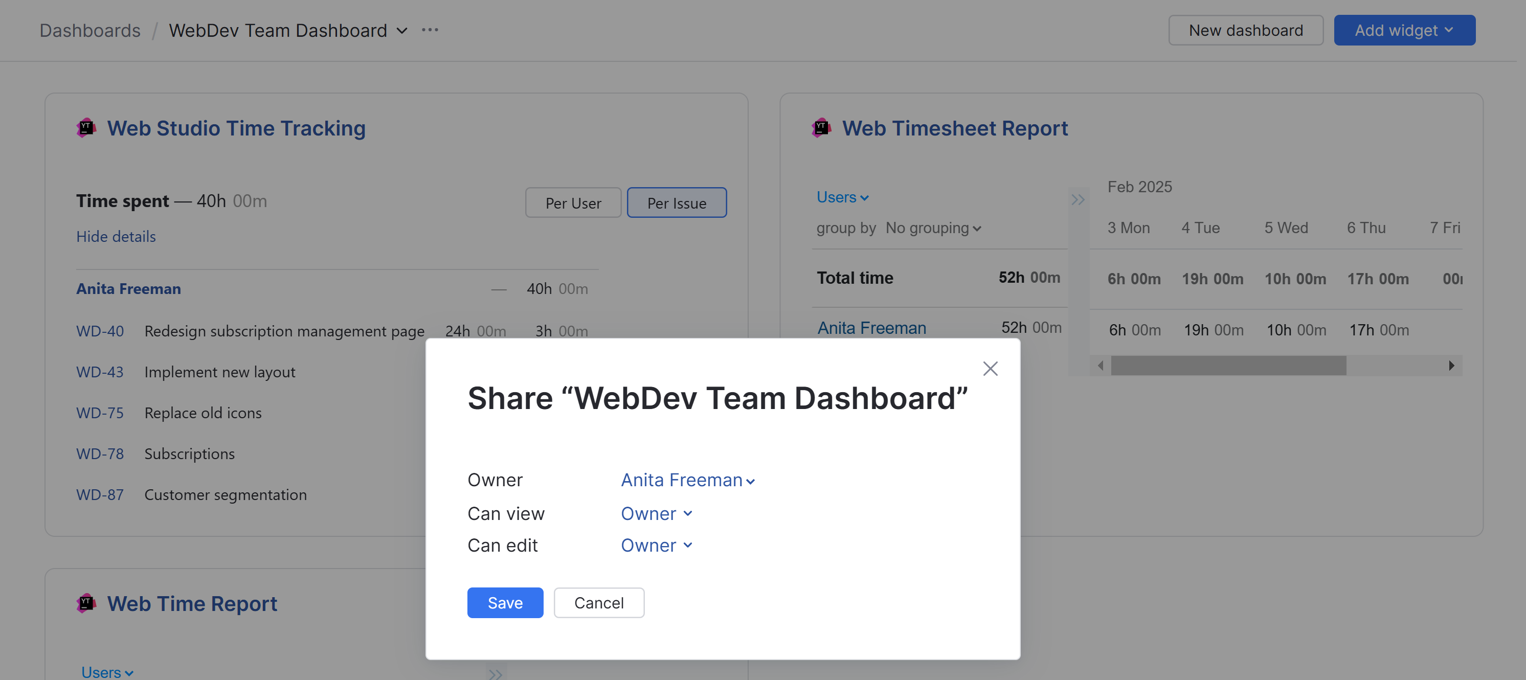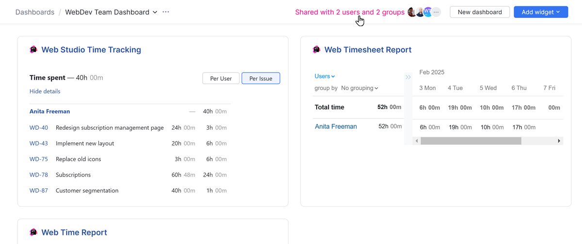 This feature is especially useful if you manage a team. You can create a dashboard with widgets that contain information that is useful for everyone on the team. When you share the dashboard, every member of your team has access to the same information.