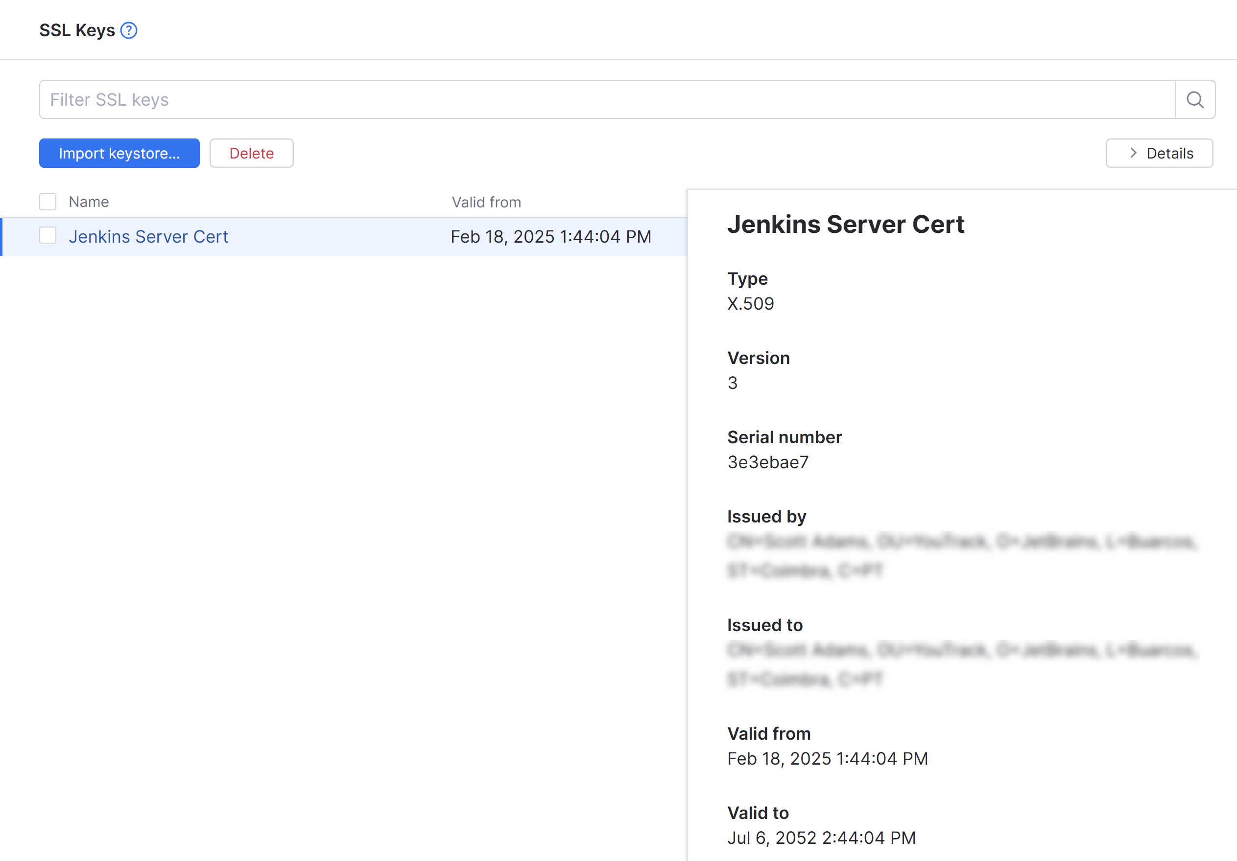 Delete | Click the Delete button to remove a key from YouTrack. Use this option to remove keystores that contain certificates that are expired or no longer in use. |