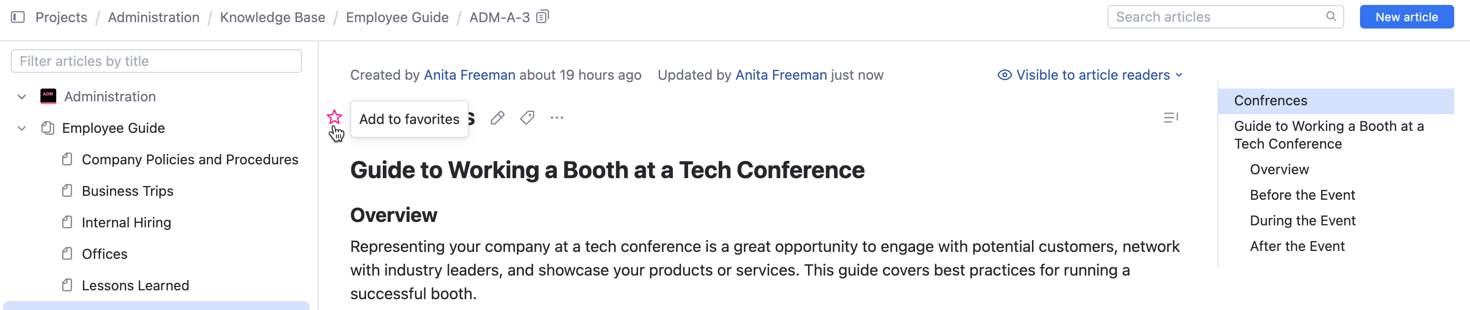 YouTrack lets you subscribe to article updates and comments by adding them to your list of favorites. To mark an article as a favorite, click the Add to favorites icon to the left of the title.