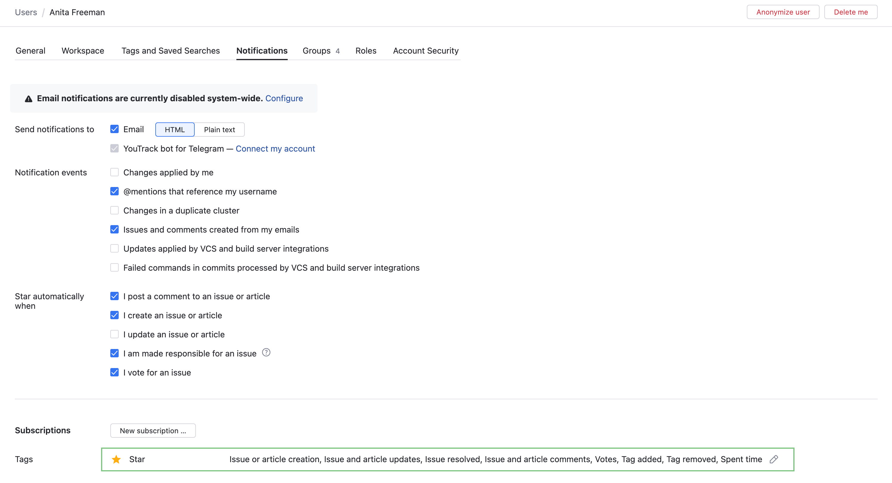 Notifications are sent according to the subscription options that are enabled for the Star tag in your YouTrack profile.