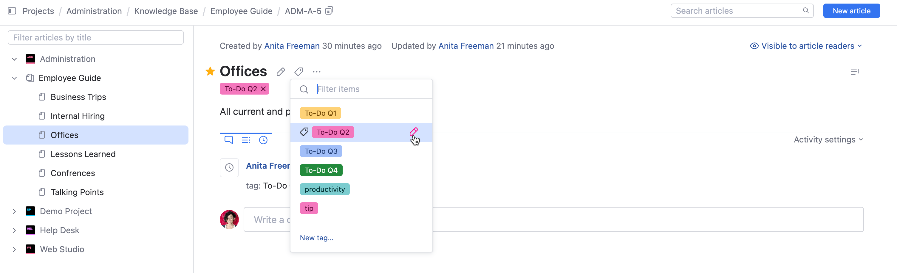 The tags you use to categorize articles are also available for use with issues and helpdesk tickets. This means you can use a single scheme to group and search for content across the application.
