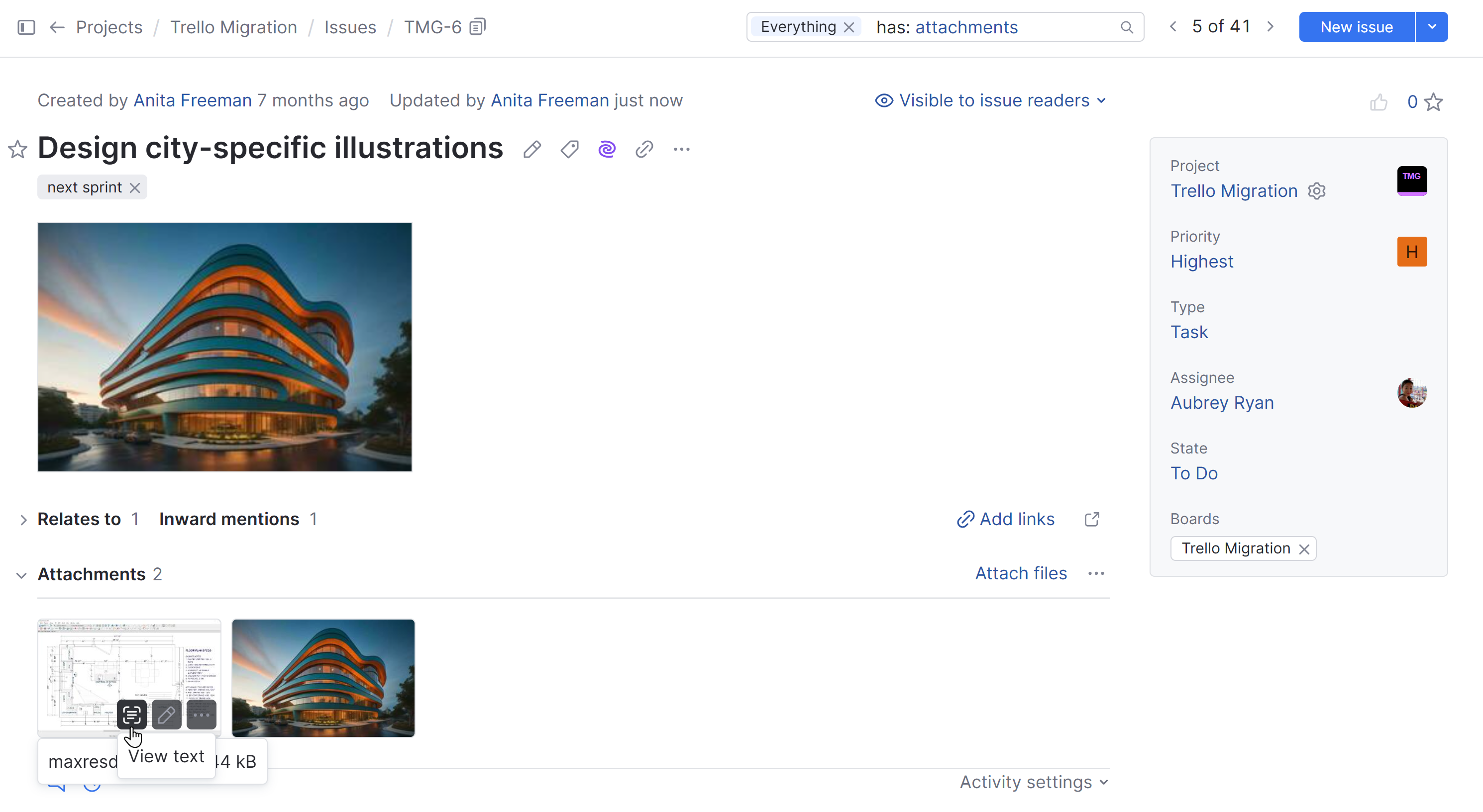When YouTrack has finished processing an image and found text, the View text icon appears on the image thumbnail in the attachment preview.