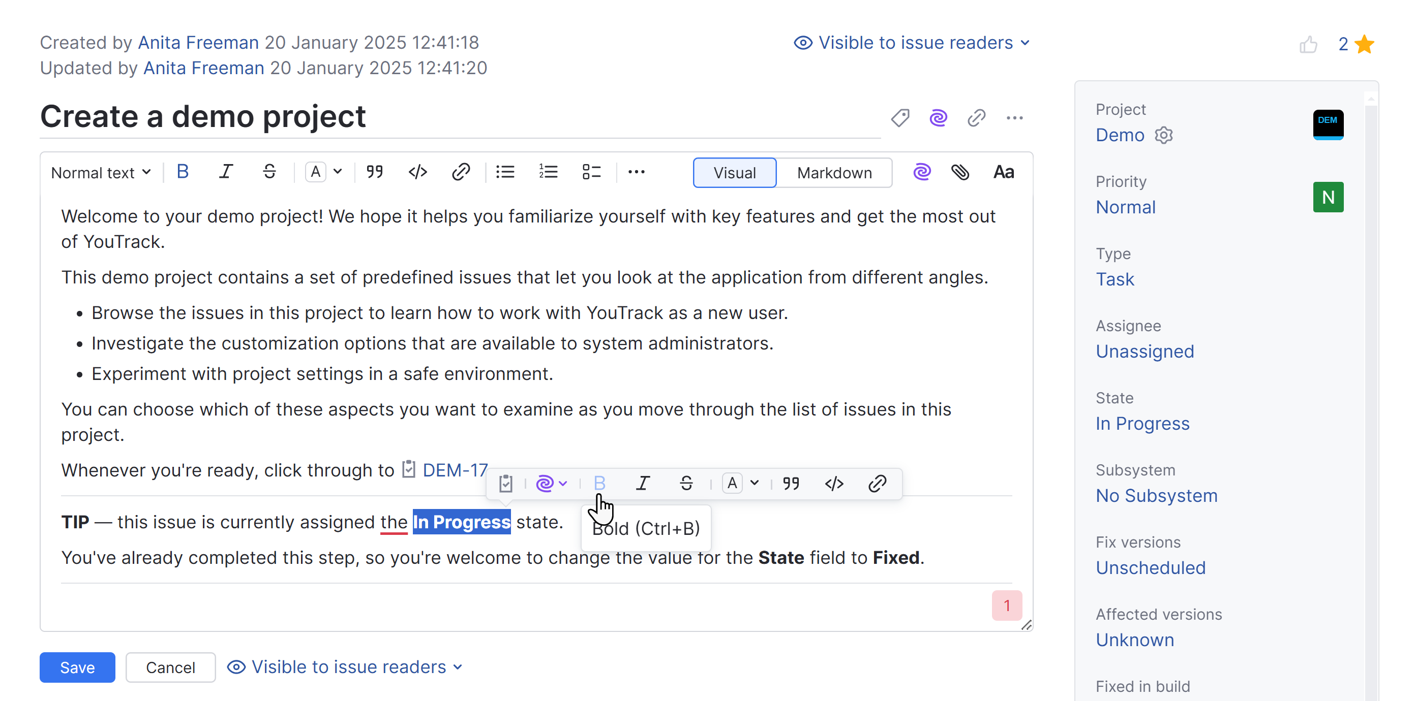 The text selection toolbar is a feature found in YouTrack text editors. It provides you with a shortcut to create new relevant issues, AI assistant tools, and access to essential text formatting and editing options.