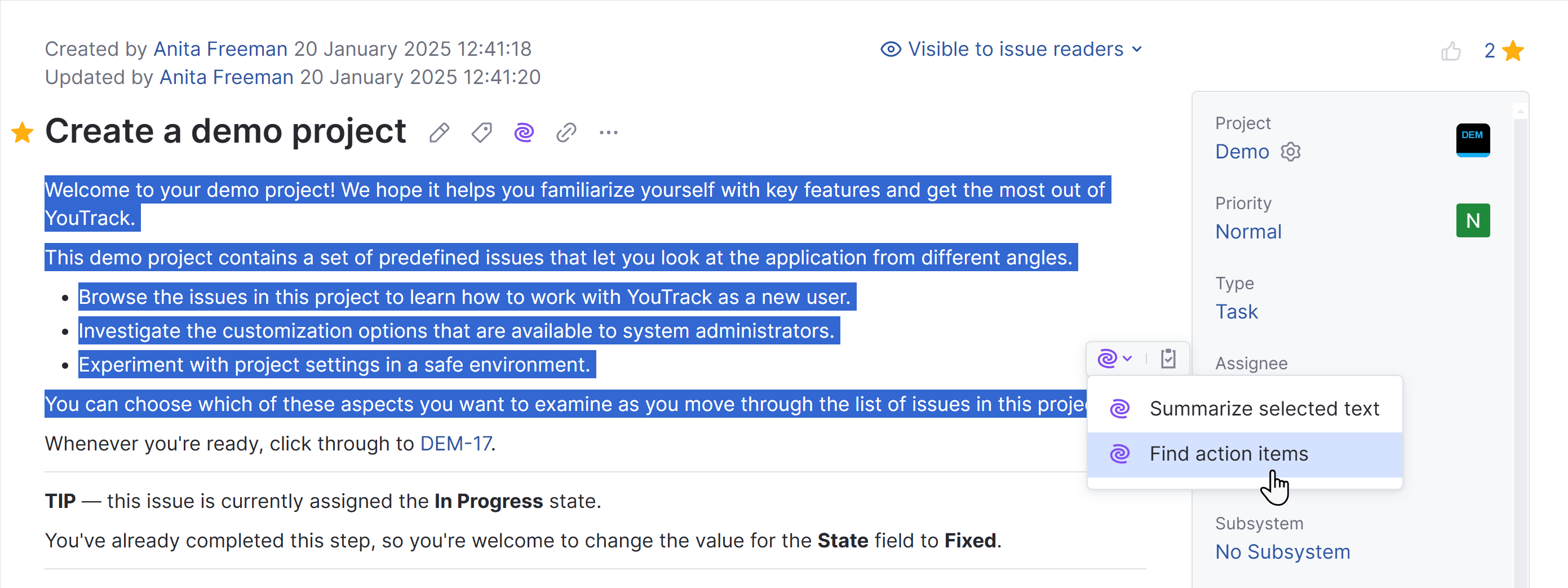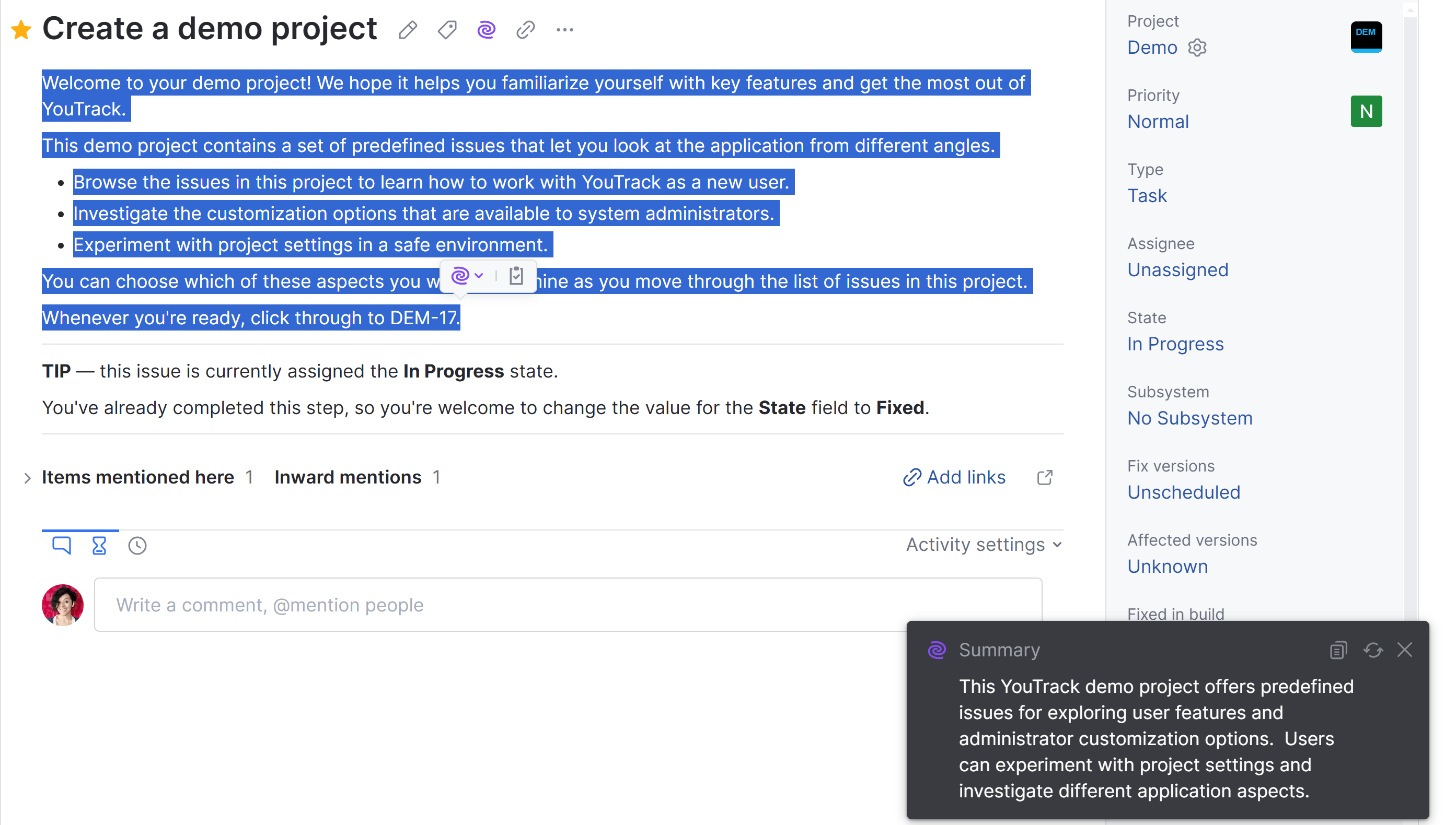 You can select text in an issue, article, or comment and have JetBrains AI assistant generate a short summary of the selected text.