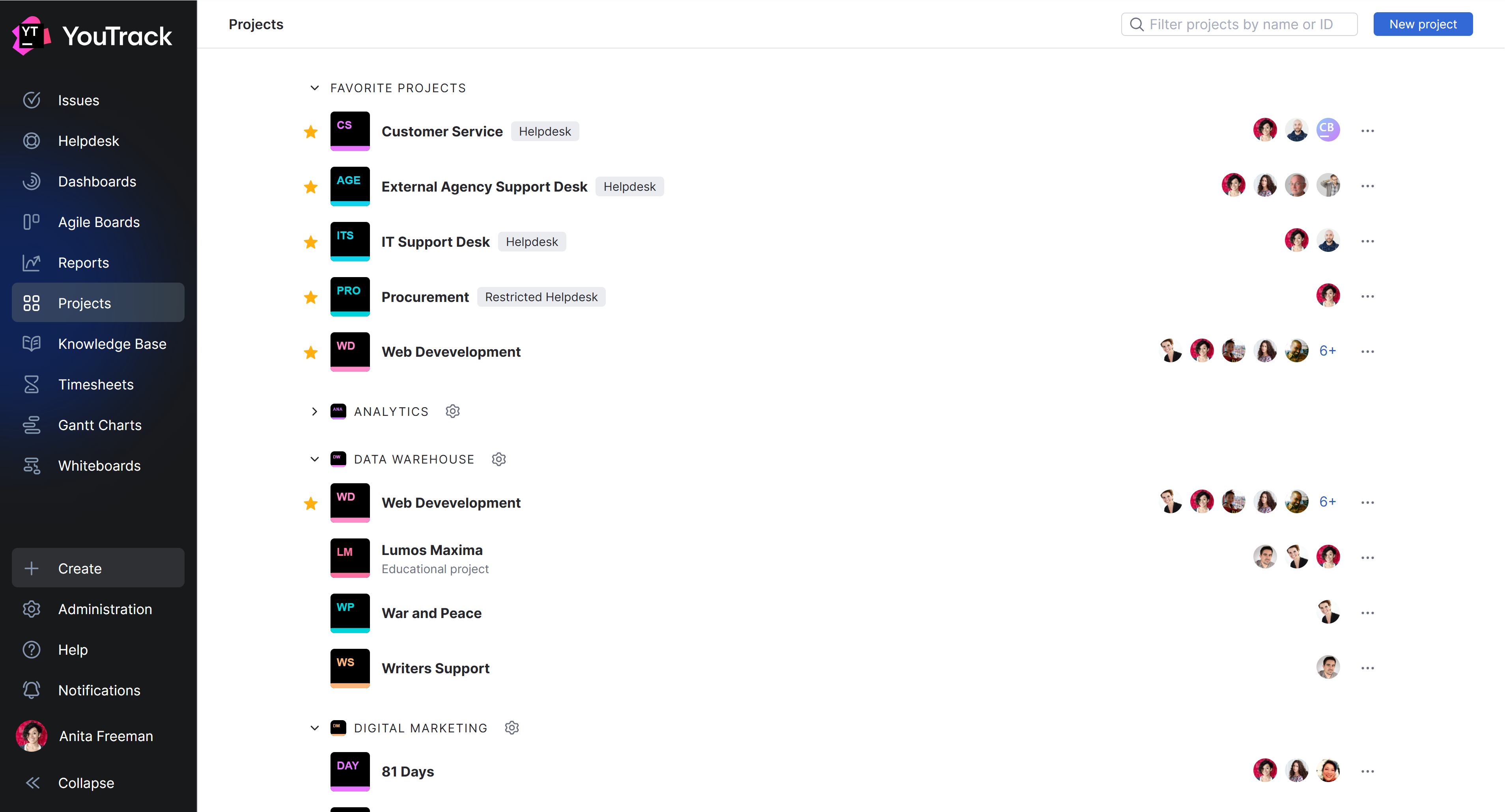 Independent projects | This section displays all the projects in YouTrack, including projects that you've added to your list of favorites, which aren't added to any organization. In installations where the projects aren't assigned to organizations, the projects are shown in a single list. When the list exceeds 10 projects, click the Show more projects link at the bottom to expand the list. |