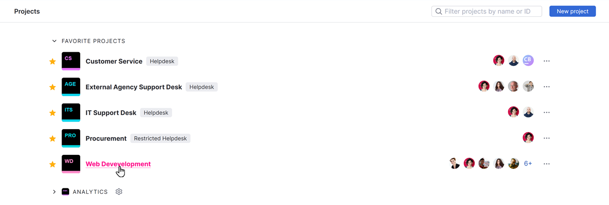 Favorites | Any project that you've marked as a favorite is displayed at the top of the projects list as well as at the top of the list in its respective section.