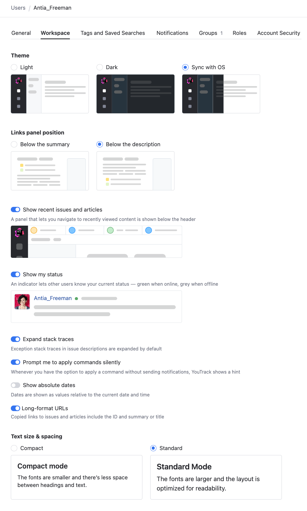 Workspace | Lets users view and customize their personal experience in YouTrack. Users can select their preferred theme, the location of various interface elements, online status indicator, and more. |