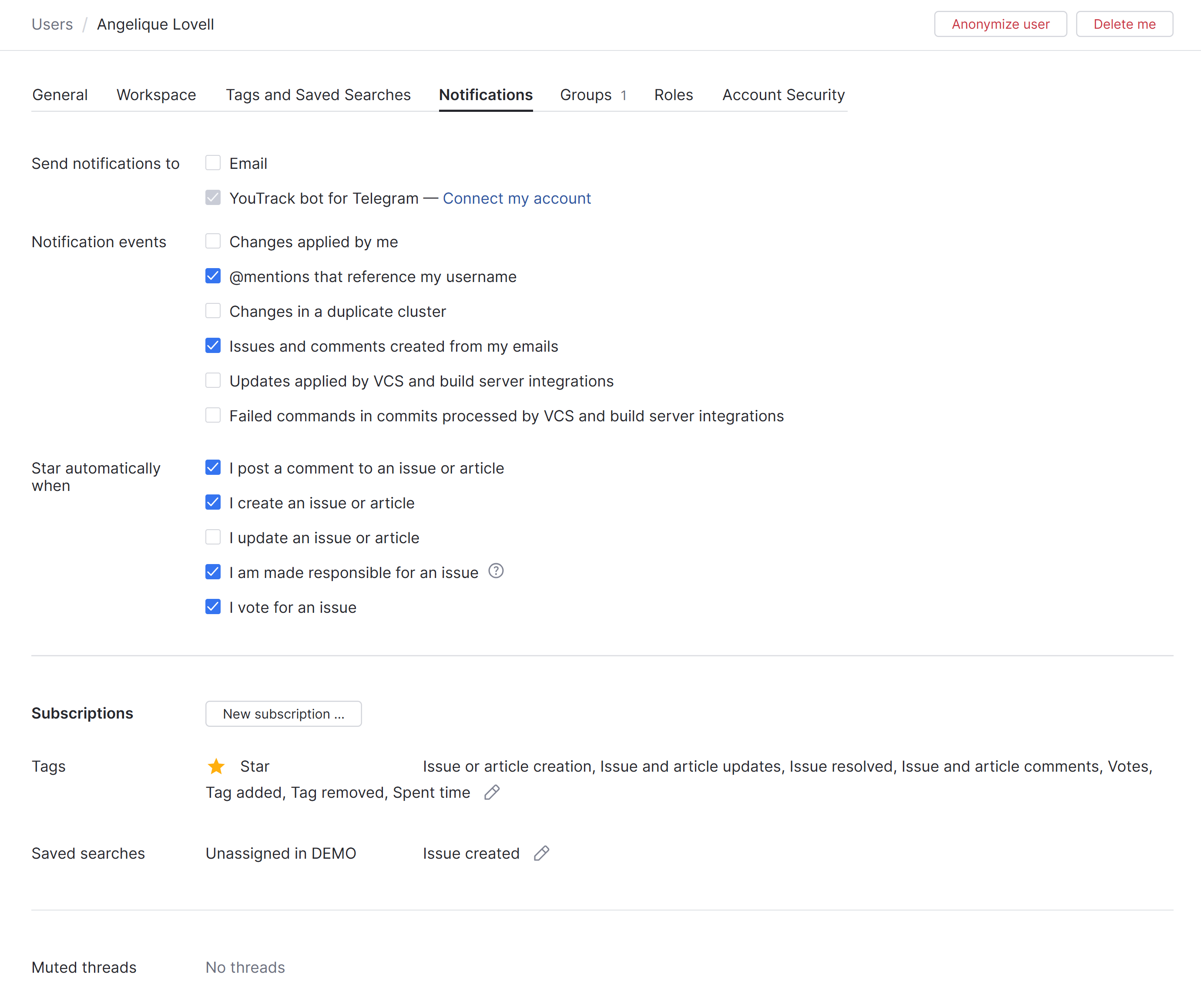 Configure the general notification scheme, add subscriptions, and update subscription settings on the Notifications tab. You might want to access these settings when users complain that they receive too many notifications from YouTrack. Here, you can see which options they have enabled and verify how they have set up their subscriptions.
