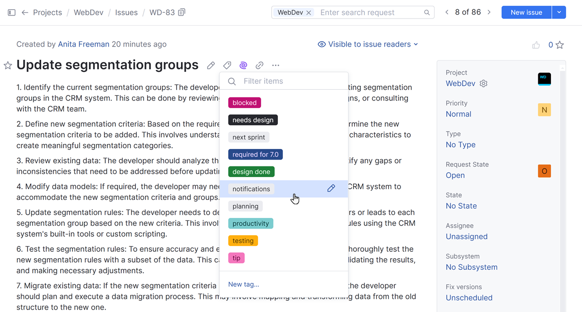 Make a tag visible to specific users and members of selected groups and project teams. These users can see the tag and use it as a filter to search for issues.