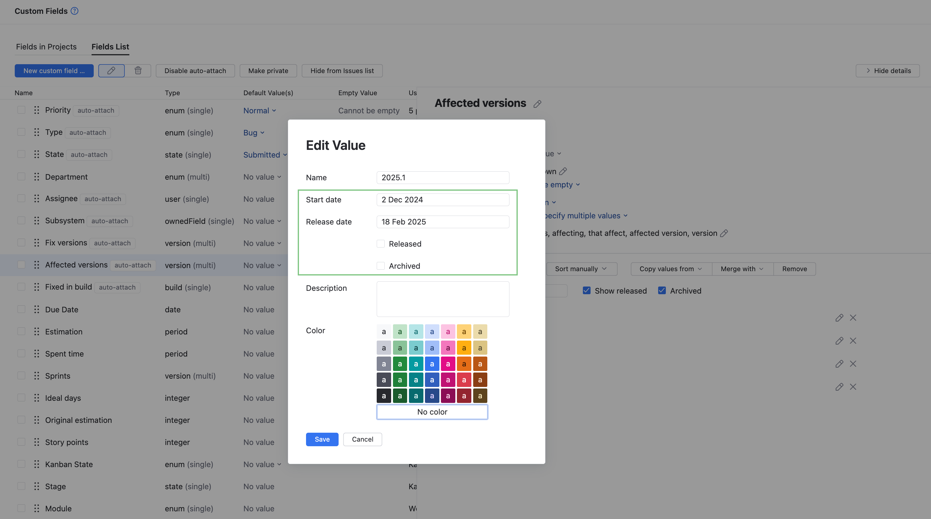 Archived | enum, ownedField, state, version, build | Indicates whether the value is archived, stored as a Values that are marked as archived are not available in the drop-down list for custom fields. This means that users cannot set the value for the field to an archived value directly in the user interface. If one or more values that are currently assigned to the field are archived, a user can clear the selection to remove these values from the field. Archived versions are still available to commands, workflows, and the REST API. This means that you can use commands to add or remove archived values or update these values programmatically. |