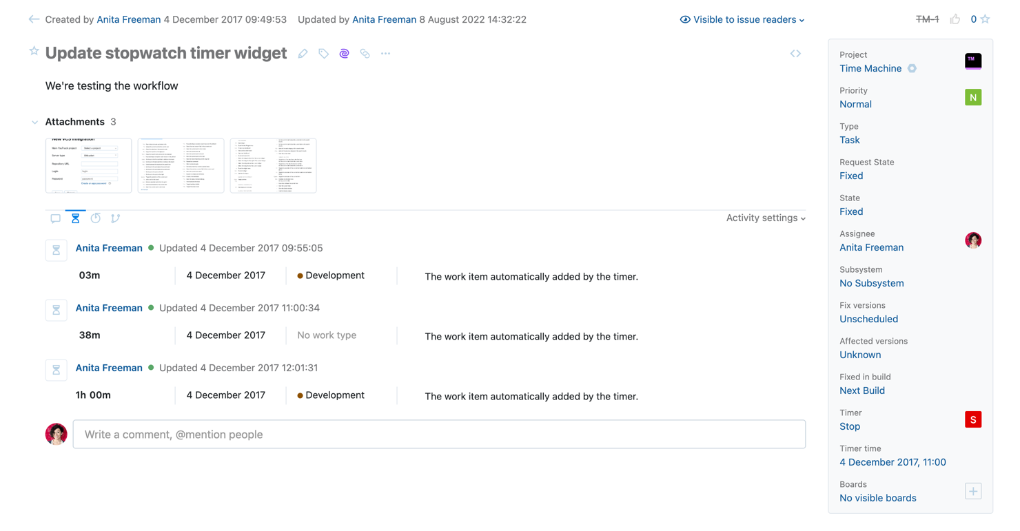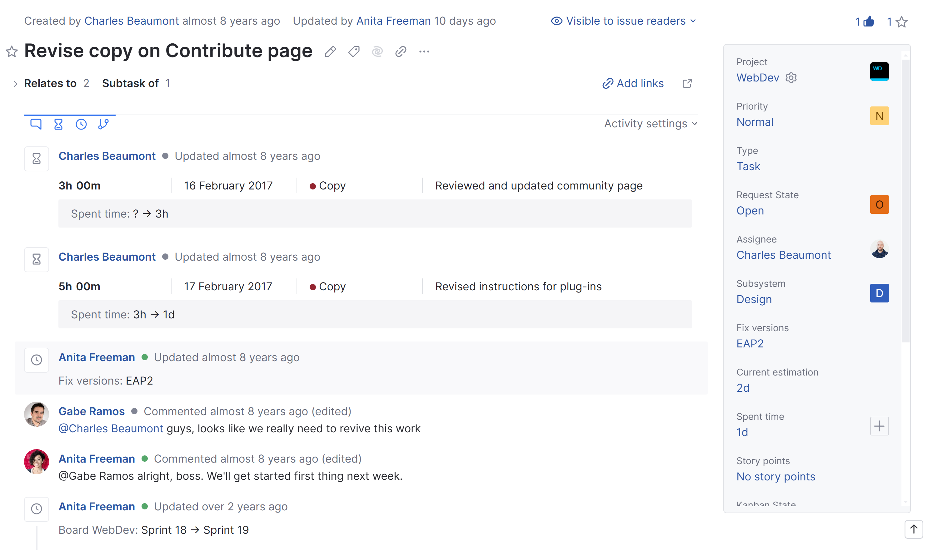 Here's an example of an activity stream that shows various issue history items, spent time, and comments:
