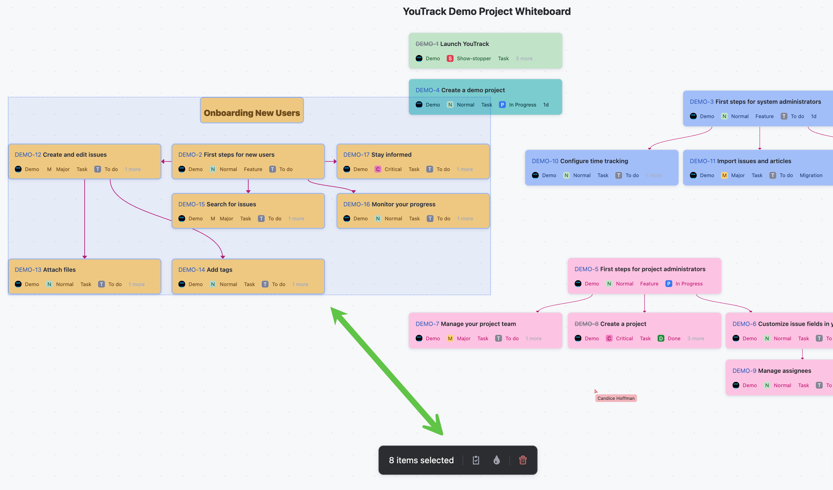 You can select multiple elements on the whiteboard at once to perform actions such as moving, converting cards to issues, background color, or deleting them as a group. Click and drag a highlighted box over the desired elements on the whiteboard, or use the search bar to select multiple elements.