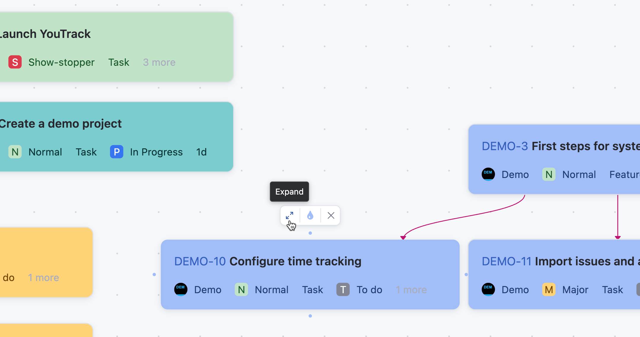 The issue and article card toolbar offers quick actions for managing the cards on the whiteboard. You can expand the card to open the issue or article, assign a color for organization, or remove it from the whiteboard without affecting the item in YouTrack.