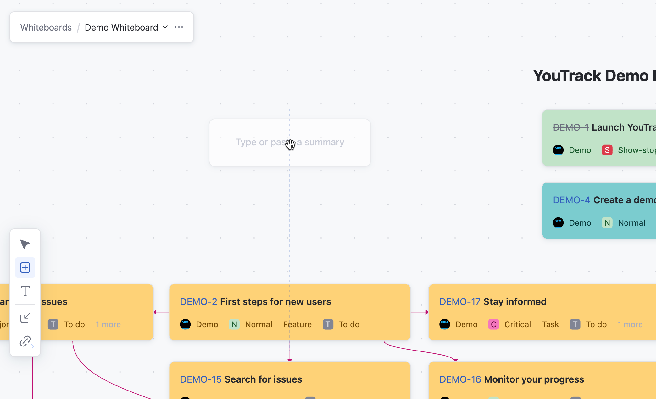 You can add existing issues and articles onto a whiteboard as cards. Additionally, you can convert text cards into issues or articles whenever needed, making it easy to turn ideas into actionable tasks or documentation.