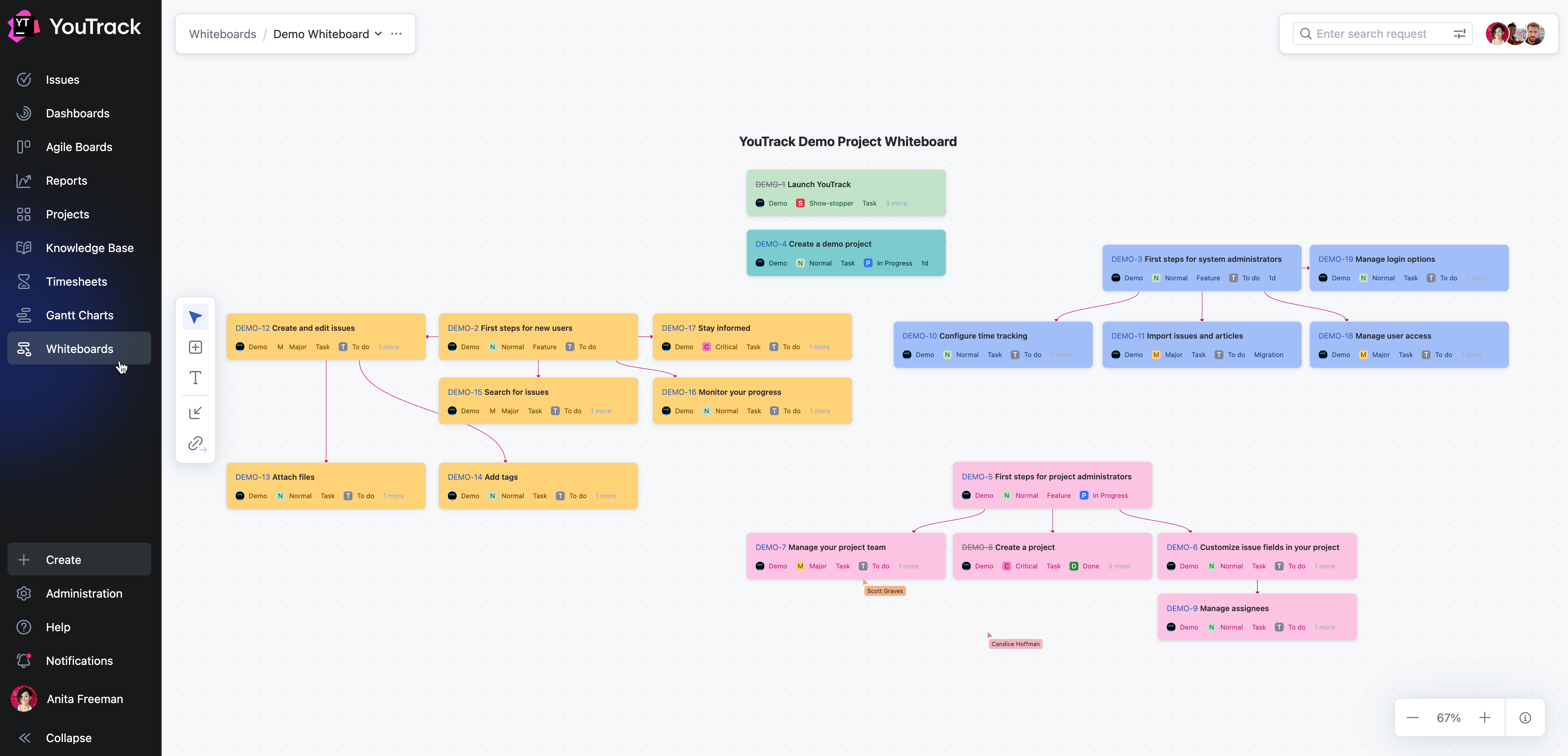 Whiteboards in YouTrack offer a flexible, visual space that lets you plan, brainstorm, and collaborate effectively. With the help of a digital whiteboard, you can break down ideas, organize your workflows, and link them directly to issues and articles in YouTrack.