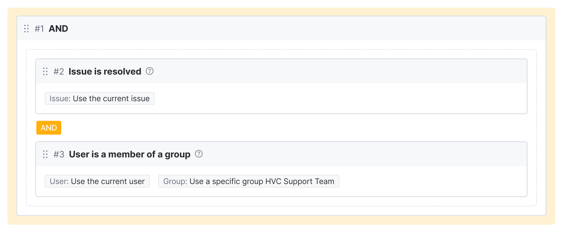 Here's a block that will only run a workflow rule when the issue is resolved and the user who updates the issue is a member of the HVC Support Team.