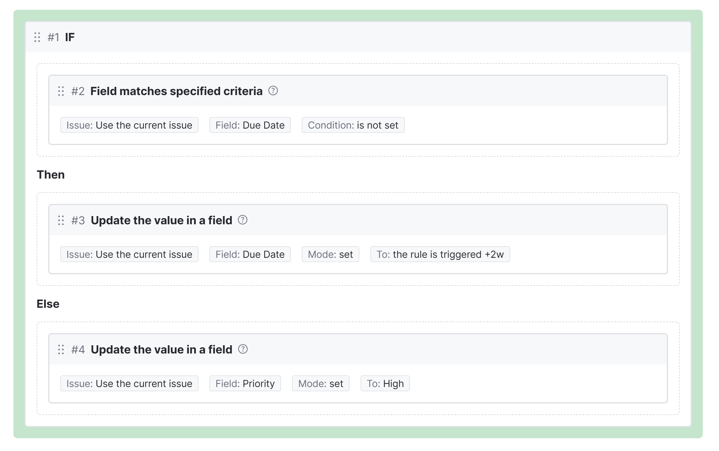 For example, the following IF block checks an issue to see if a value has been assigned to the Due Date field.