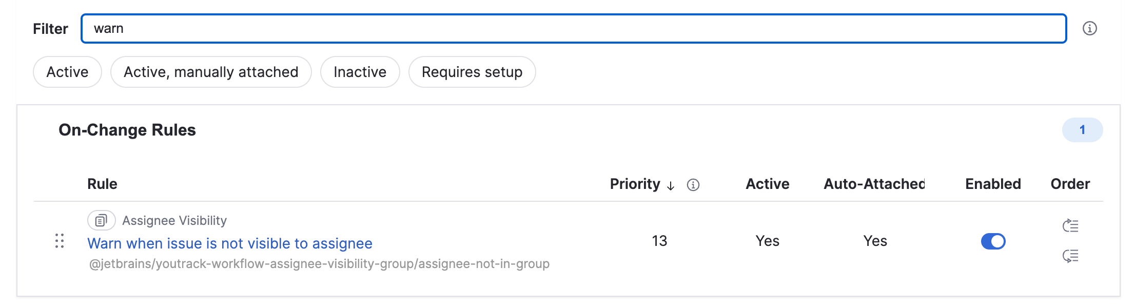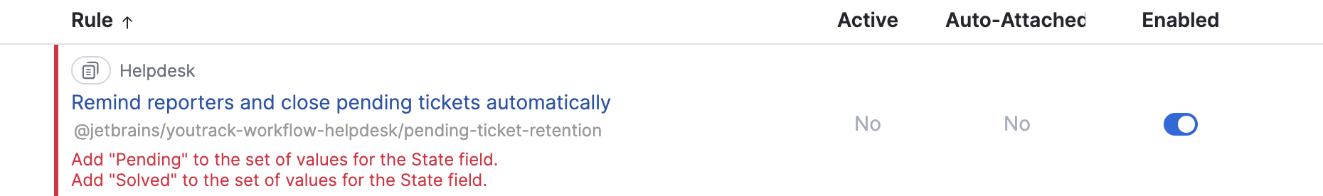 The clickable title of the rule. When you click it, a new tab opens with the JavaScript workflow editor. You can make necessary changes to the rule script there. For more information about the workflow editor, see https://www.jetbrains.com/help/youtrack/devportal/Web-based-Workflow-Editor.html.