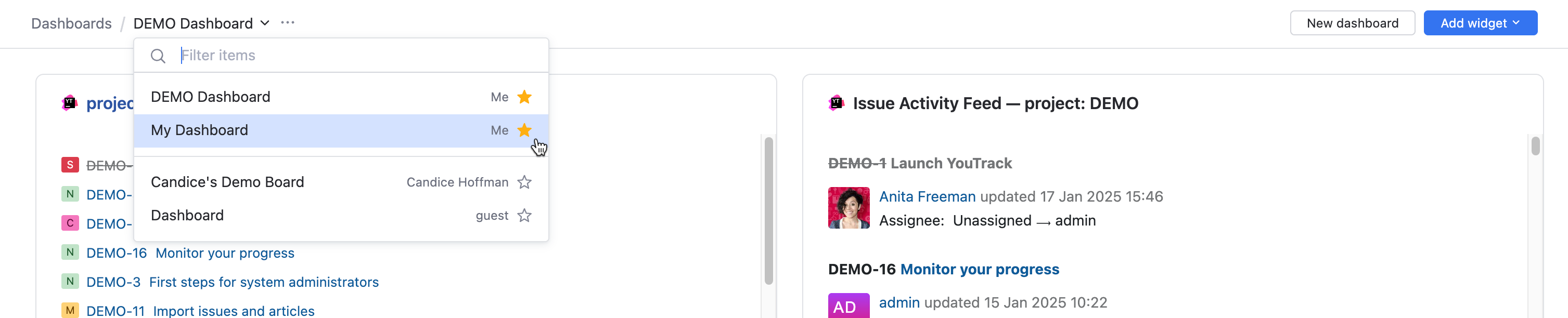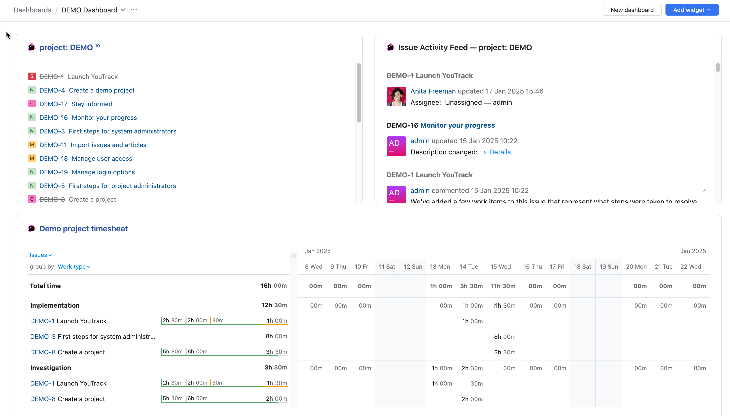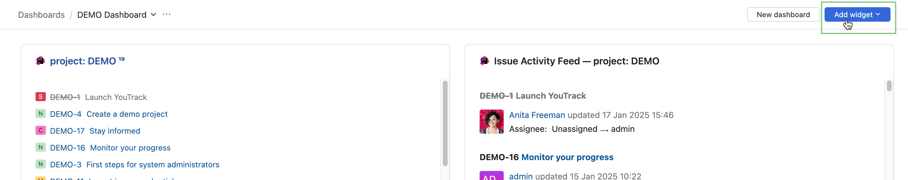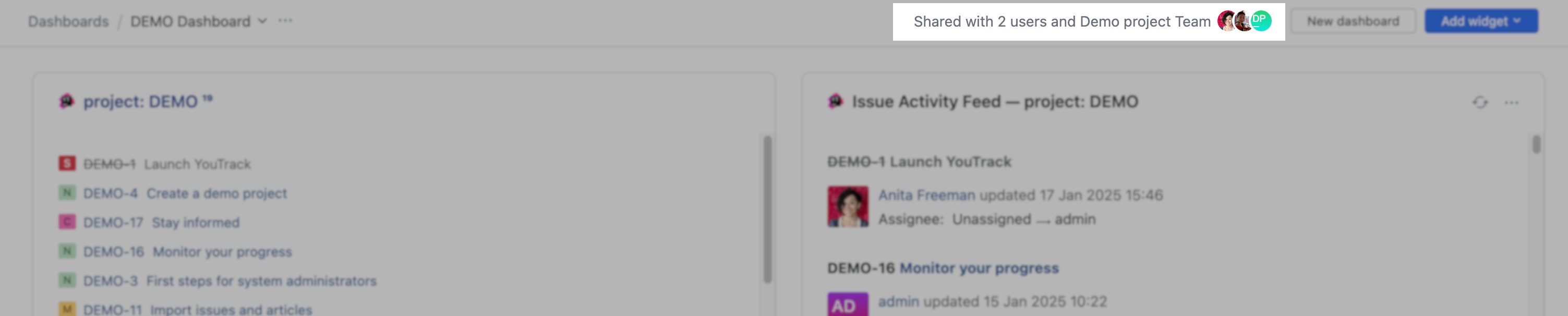 A dashboard displays widgets. The different widgets provide you with a quick view of data and insights for information in your YouTrack environment.
