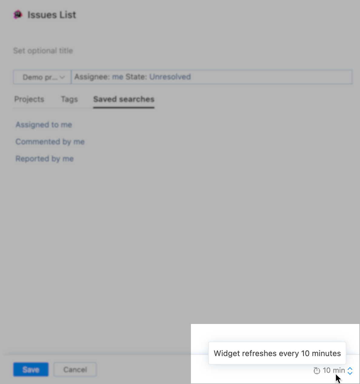 Dashboard widgets are designed for dynamic data, giving you up-to-date information that you can use while tracking your project issues. YouTrack gives you options on how often you would like your widgets to refresh.