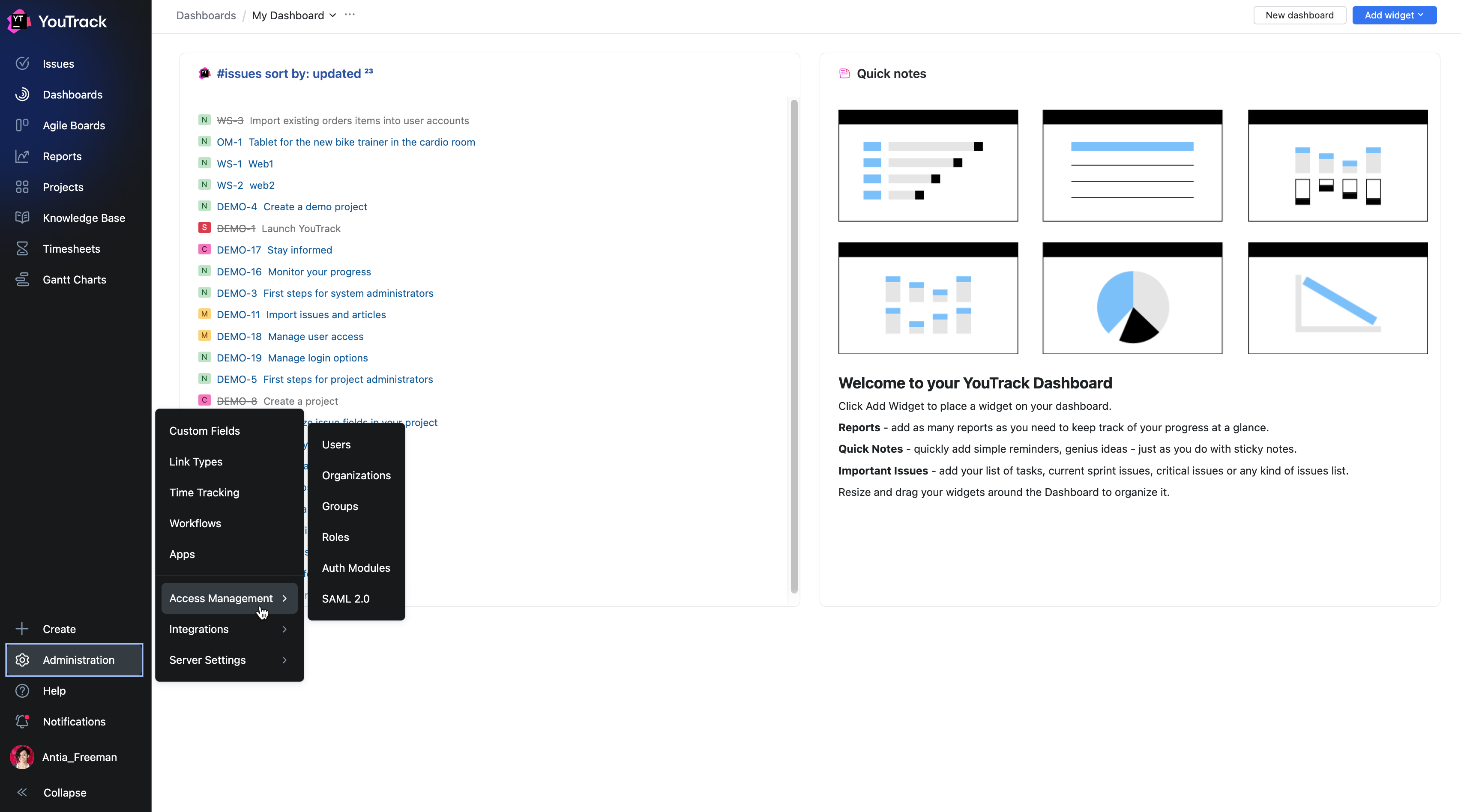 The Access Management section of the Administration menu links to pages that let you manage access to YouTrack. To access these links, click Administration in the main navigation menu, then select Access Management.