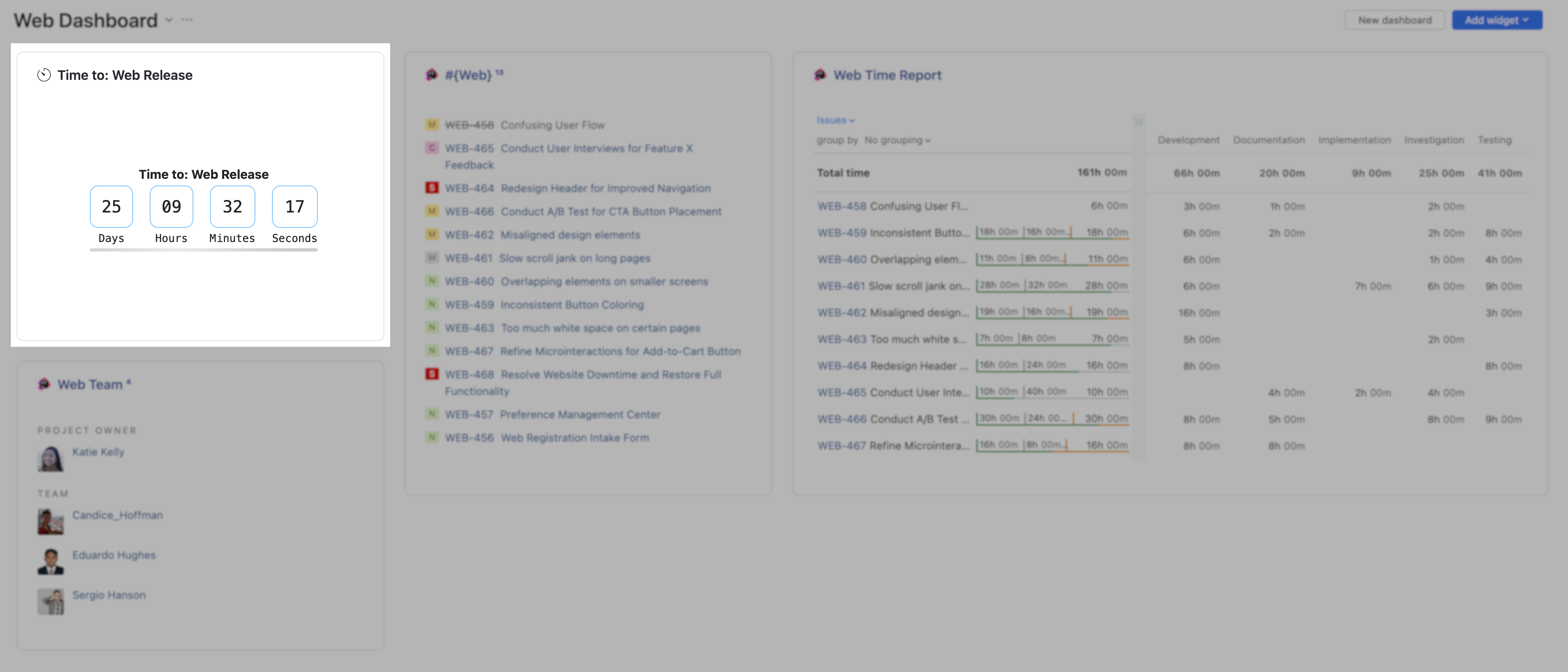 A Countdown widget displays a timer on your dashboard that is either counting down to a set time and date or counting the elapsed time from a set time and date.