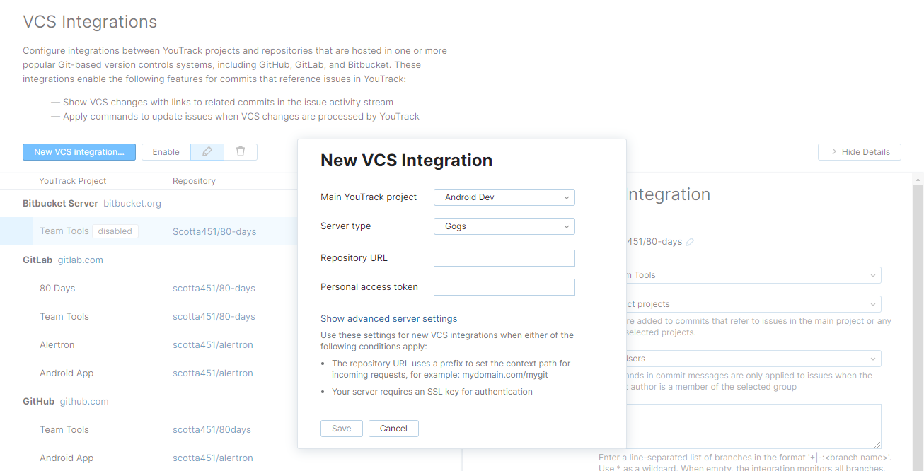 • Your YouTrack project is integrated with the selected repository in Gogs.