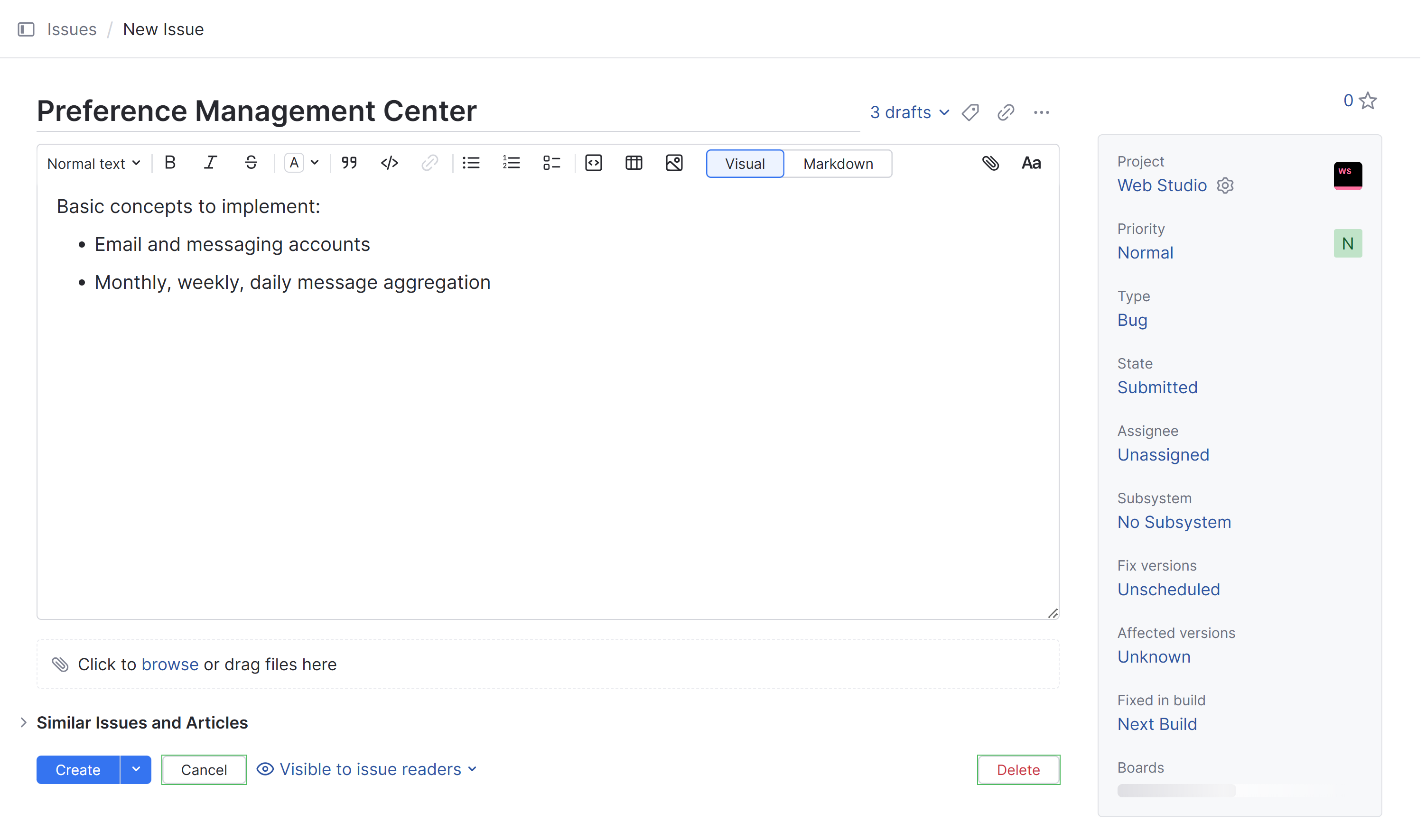 When you create an issue, YouTrack saves the data automatically as an issue draft. To save the draft, you don't need to do anything at all. The following actions are available when creating an issue draft: Just click the Cancel button to exit the New Issue page or click Create > New issue in the main navigation to start reporting a different issue.