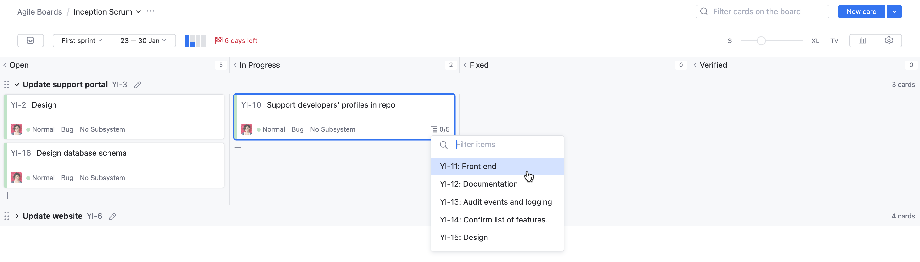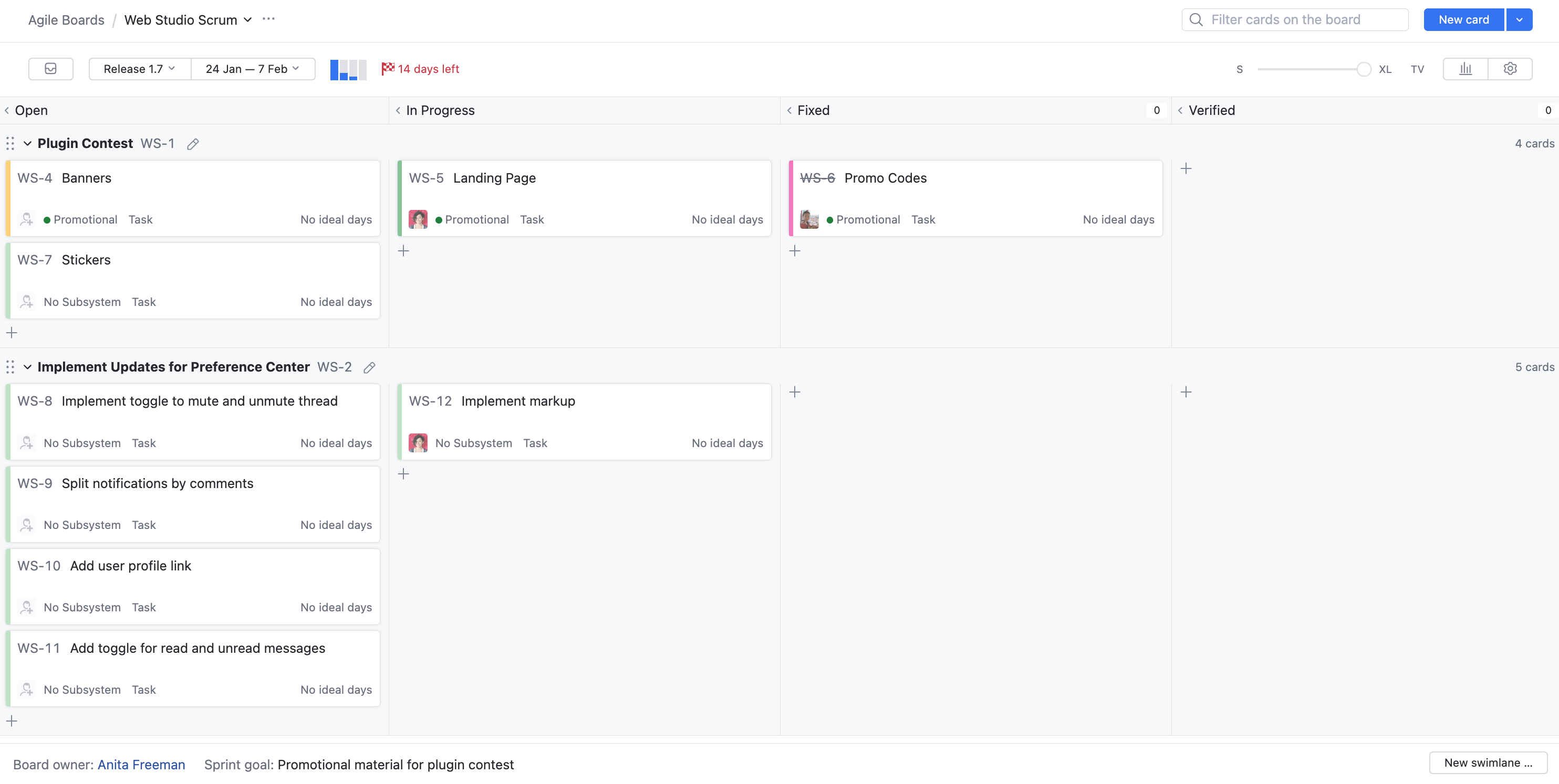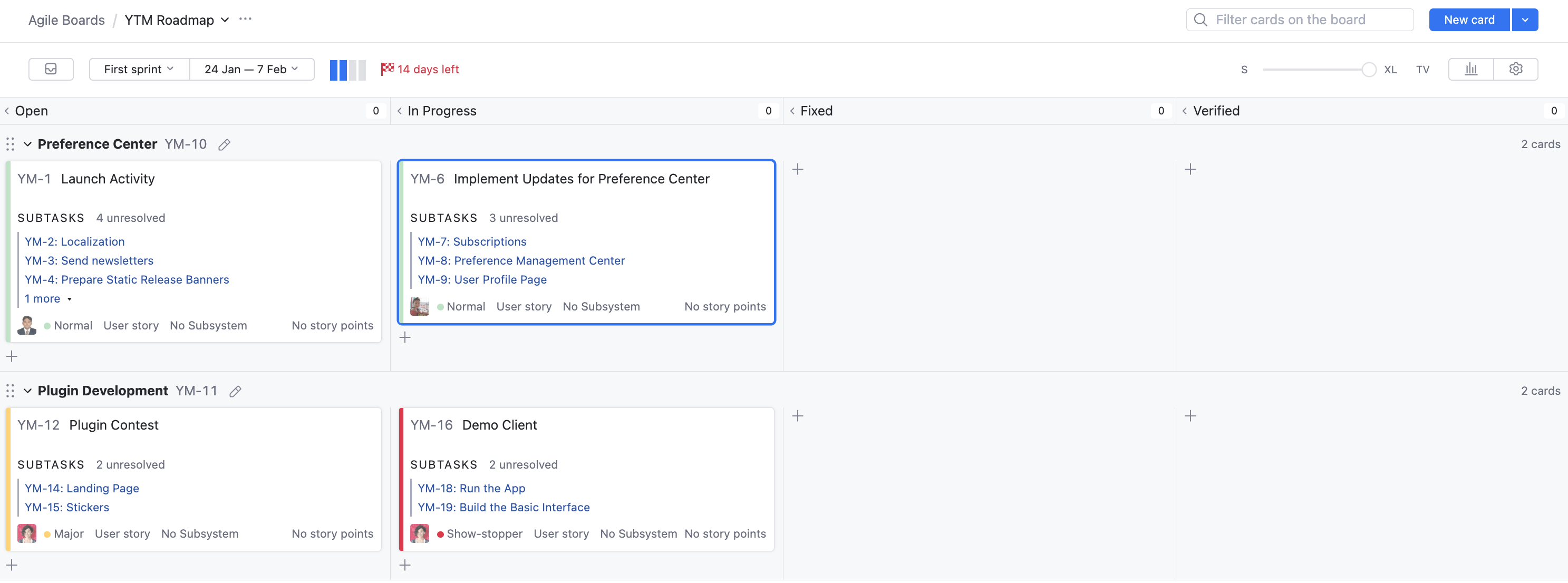 Next, set up the Project Management board. This board represents the relationship between epics and user stores. Only issues with these types are displayed on the board. Swimlanes are defined by epics. Estimation for the user stories is counted in story points.