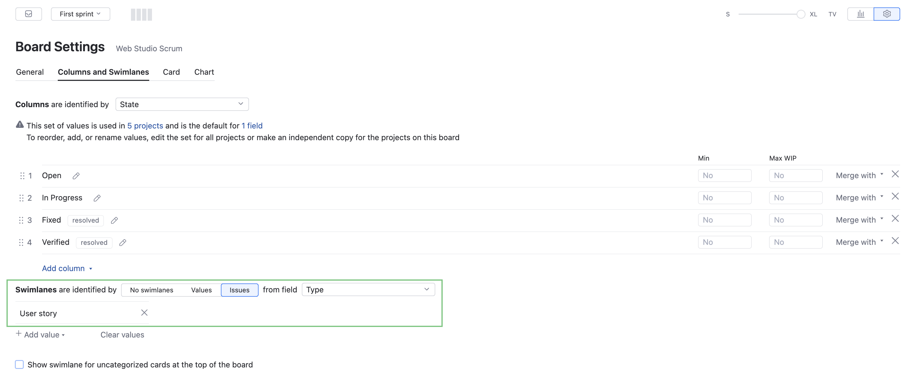 On the Columns and Swimlanes tab, check the Swimlane settings. This setting should already identify swimlanes by issues from the Type field and use User Story.