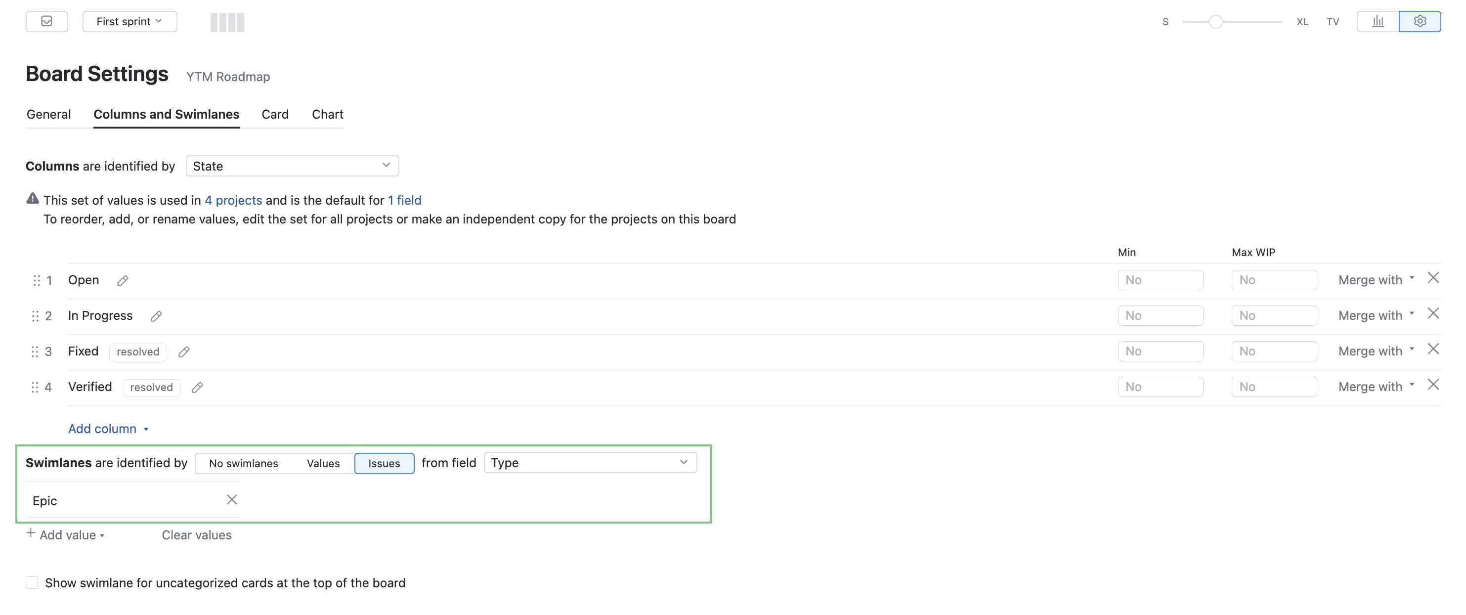 On the Columns and Swimlanes tab, update the settings to identify swimlanes by issues from the Type field and use Epic.